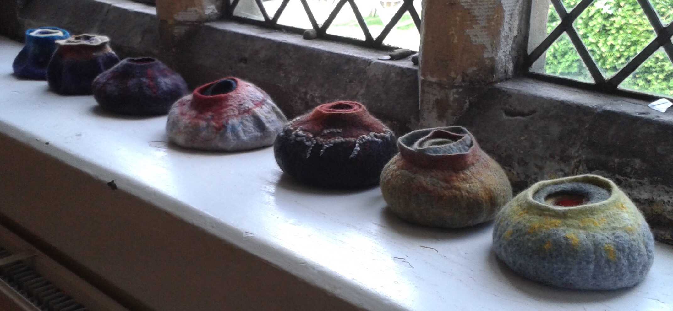 Collection of wet felted vessels made at Jenny Peppers “Multiple Resist” Workshop.