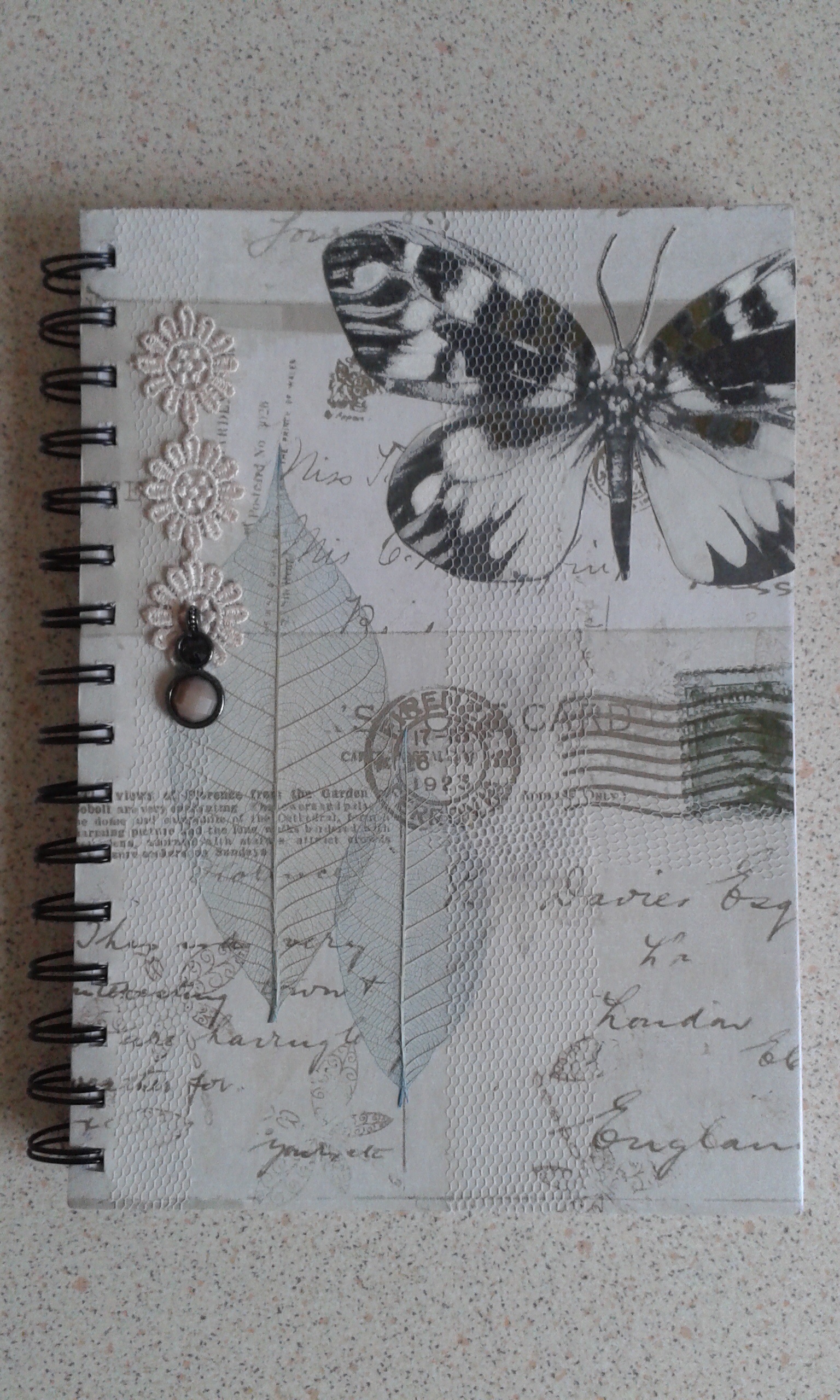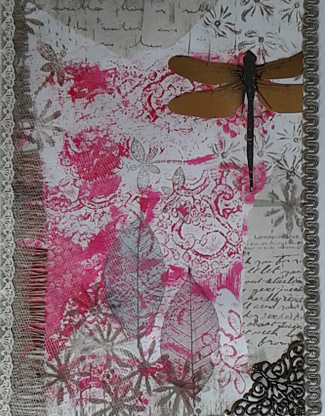 I’ve been looking at several mixed media projects on youtube recently, such as art journals, altered book covers, etc and thought it would be interesting to have a go myself. I only possess one stamp, which has a couple of dragonflies on it, so I began by searching my stash for anything I could make use of as stamps/stencils. For the backgrounds I stamped with bits of painted lace and a foam flower and used sequin waste as a stencil. The butterfly, dragonfly and areas of text were all taken from B&Q wallpaper samples and the leaves were from Crafty Notions. imageStrips of white netting, added randomly, give another texture and this also has the effect of softening some of the areas. I love hessian so this had be included somewhere along with a few beads and a bit of lace.  My A5 sketchbook was next to get a makeover using the same papers, lace, etc….this was fun to do and looks like being my latest obsession!