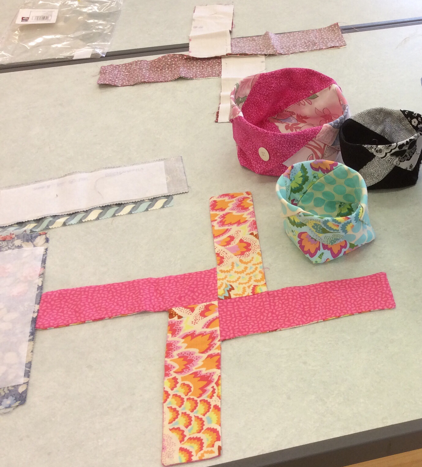 This months session began with one of the ladies demonstrating how to make a reversible ‘thread catcher’. It was a very simple design, made from eight strips of fabric, with endless possibilities for embellishing. Although intended for holding scraps of fabric or threads they could be used for holding all sorts of different things. These are cute little things to make and a great way to use up any scraps you have.