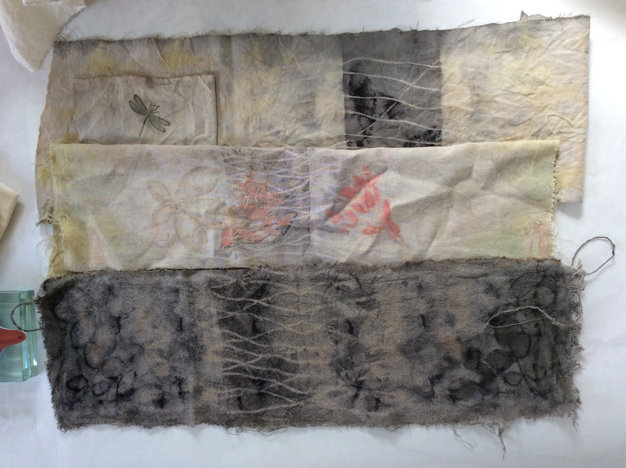Three strips of Eco dyed fabric which form the background of my Flora & Fauna quilt