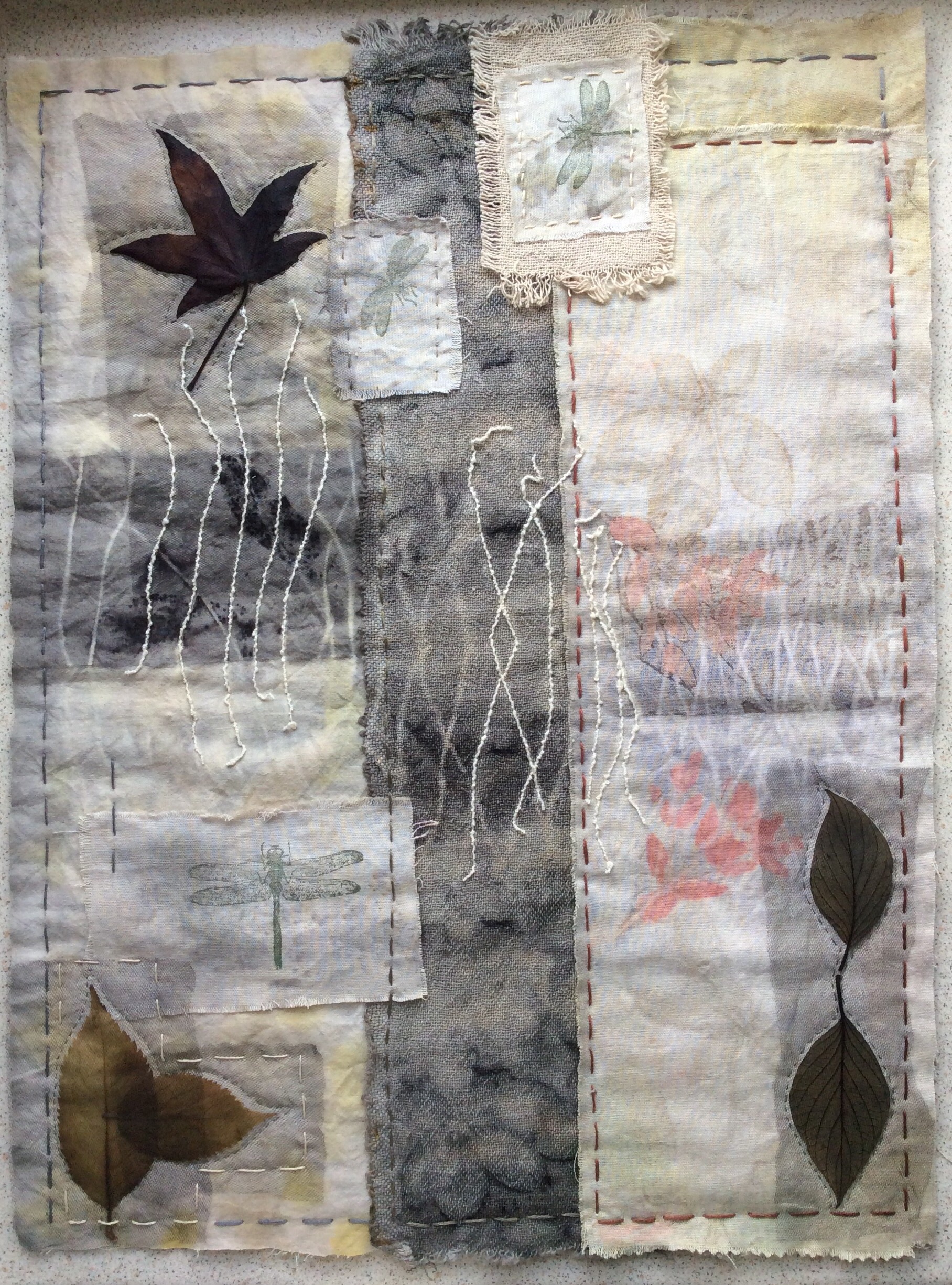 After attending the Eco Dyeing workshop at Artvango I came home all fired up and eager to start my own experiments with plants and dyeing.   My first attempt wasn’t a huge success but I did manage to make a few marks and dye some fabric which I then incorporated in a quilt for the Cranwell Contemporary Textiles challenge “Flora & Fauna”.  In this challenge we had to include “stamping and printing” so Eco printing was the obvious choice combined with some really nice dragon fly stamps from Papermania which I have had for ages but hardly used.