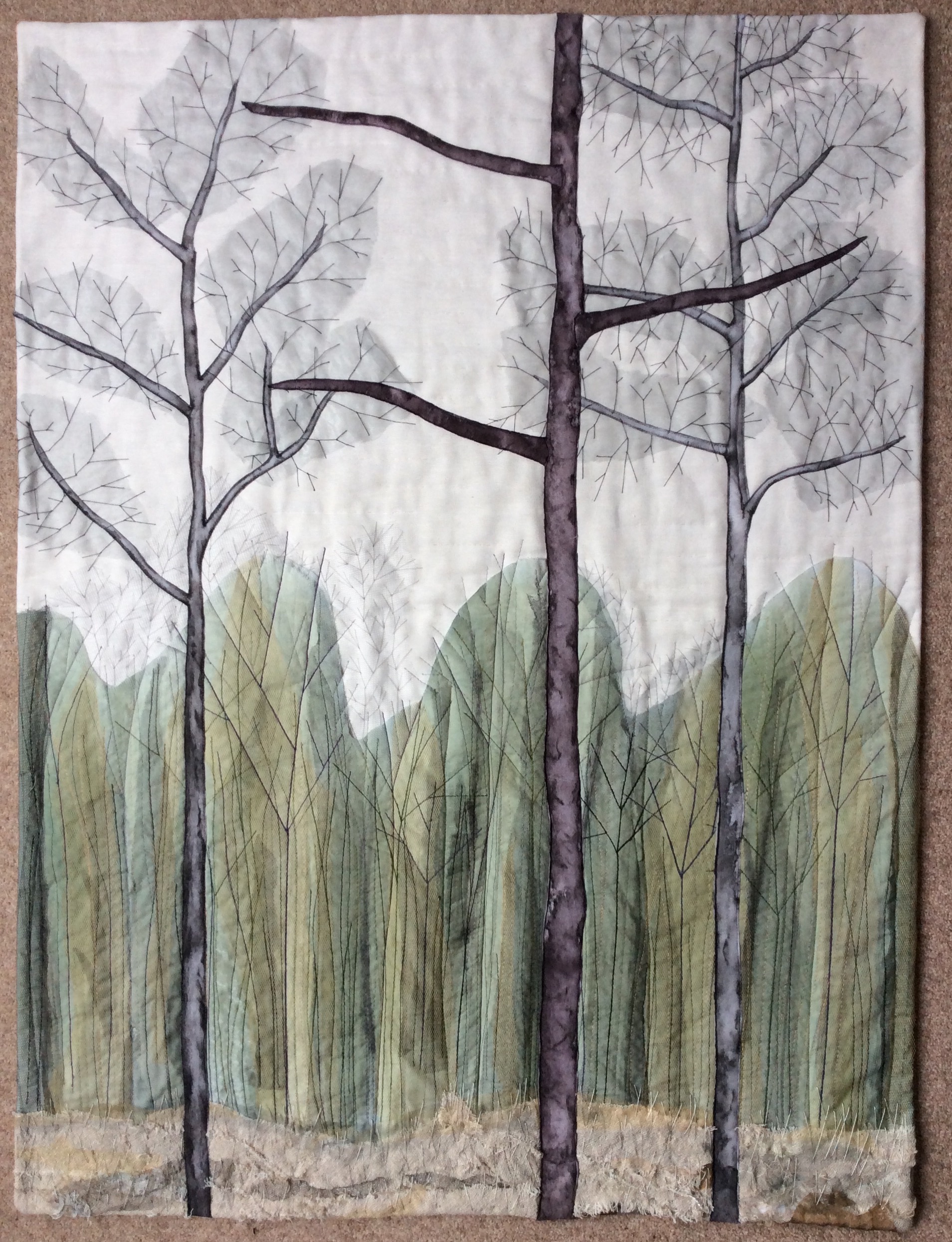 My Three Tall Trees quilt is finally finished……I think.  I haven’t put as much detail into this 30″ x 40″ quilt as I did the smaller 30cm x 40cm version, however there is the possibility that at some point before this is handed in for the David Hockney Challenge I just might add to it.