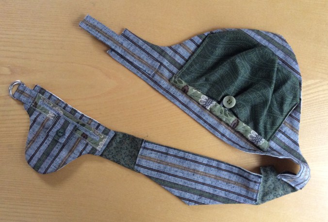 Once these pieces were made up they were all together joined using two short strips of green floral fabric. I considered making eyelets and using a buckle but in the end decided that “D” rings would be quicker, easier and just as efficient for fastening.