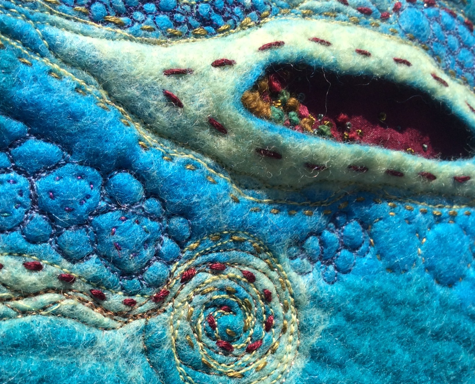 This was the first one I did, a flat wall hanging with machine and hand embroidered surface design.  The craters are filled with red satin fabric and hand embroidered knots.
