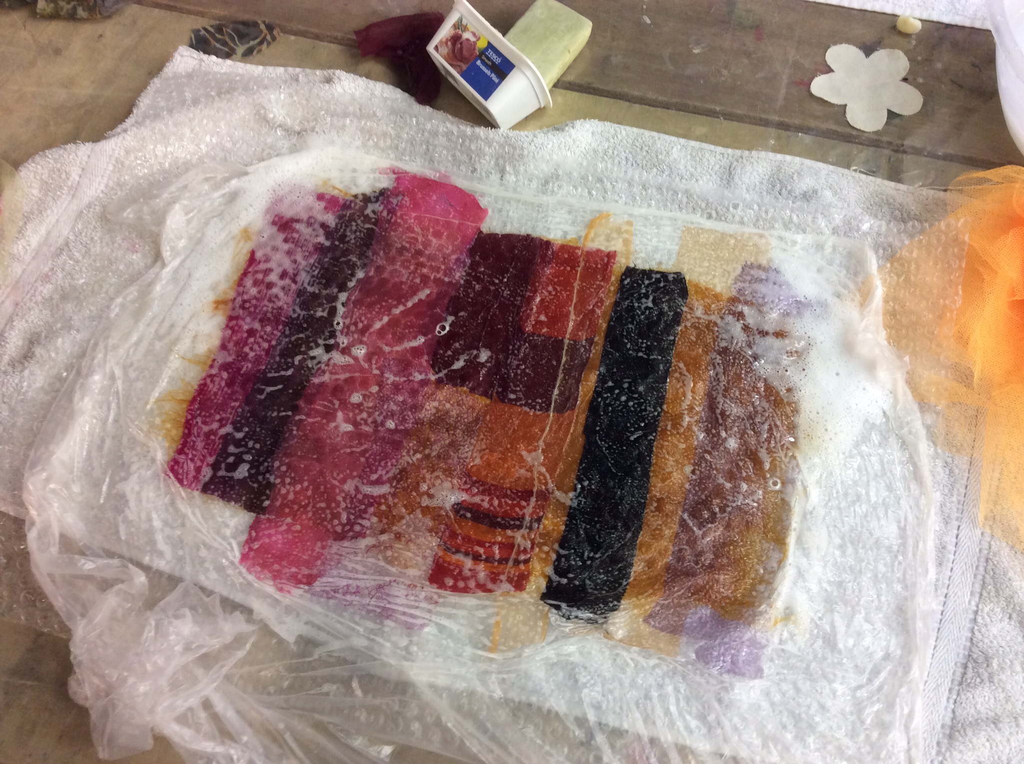 In the next photo you can see nine different scraps of scarves in the early stage of felting.