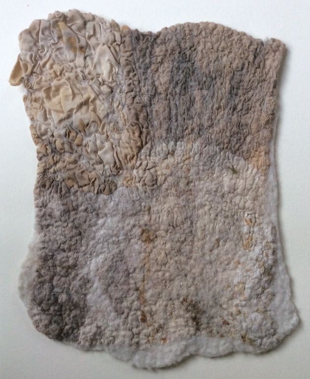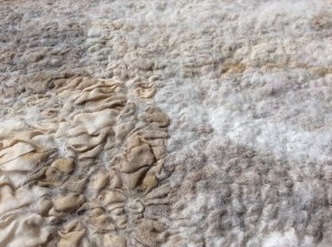 Then it was our turn.  Each sample was created with one layer of Merino wool tops and various scraps of lightweight fabric.  With Clare on hand to ensure we didn’t skint on the rubbing, we rubbed, rubbed, and then rubbed some more…..then time for a coffee and then back to rubbing……