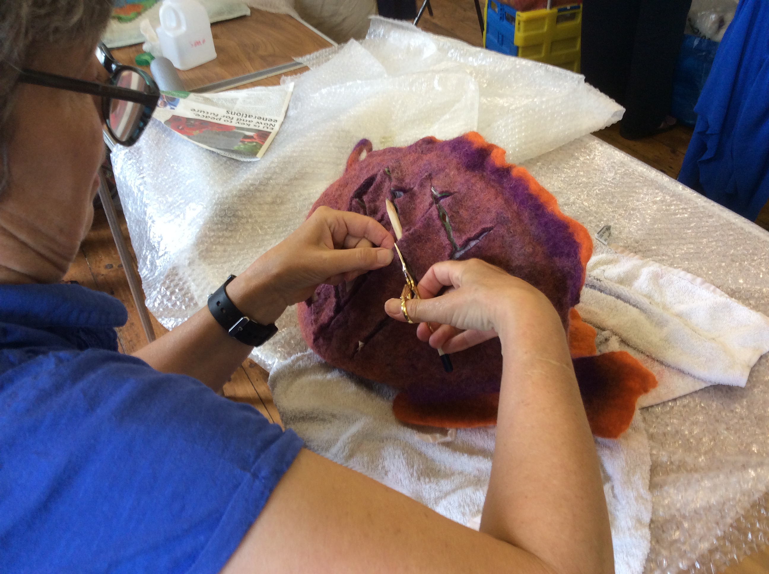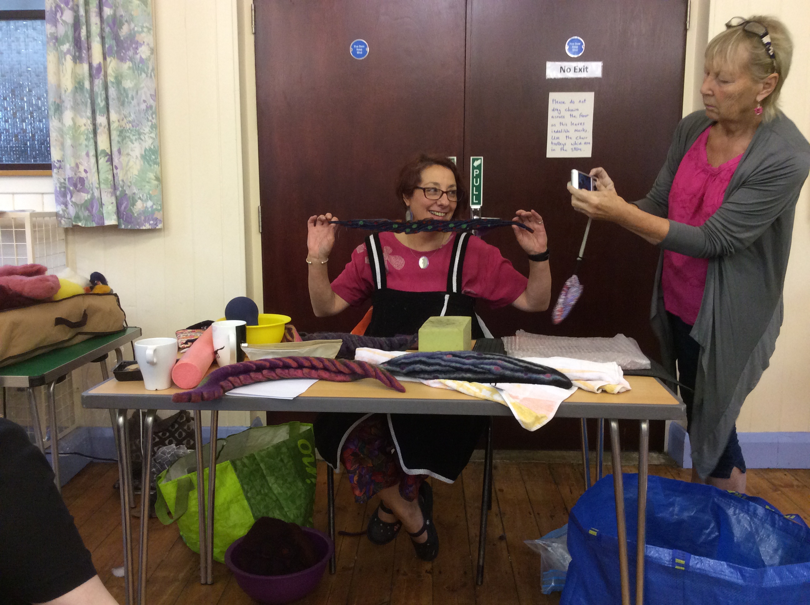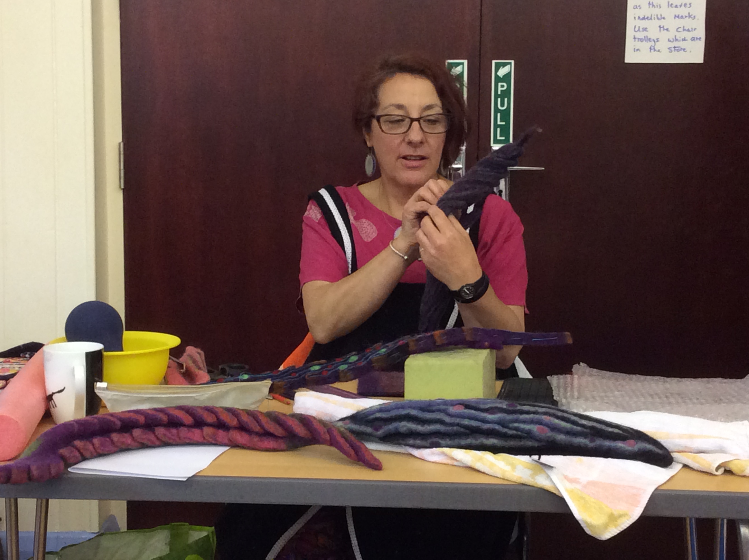 Mandy Nash demonstrating a particular wet felting technique at her workshop Experimental Sculptural Forms.