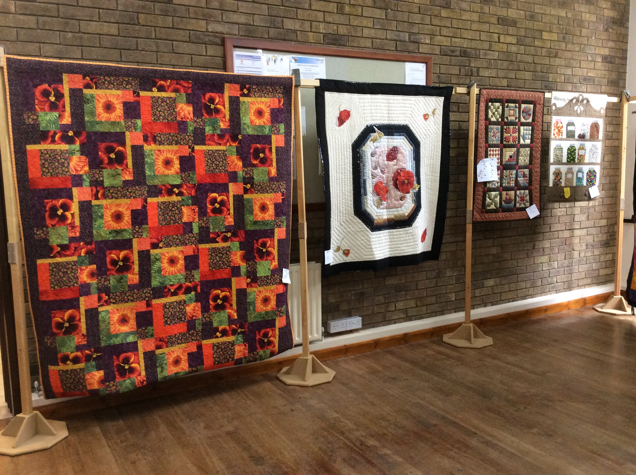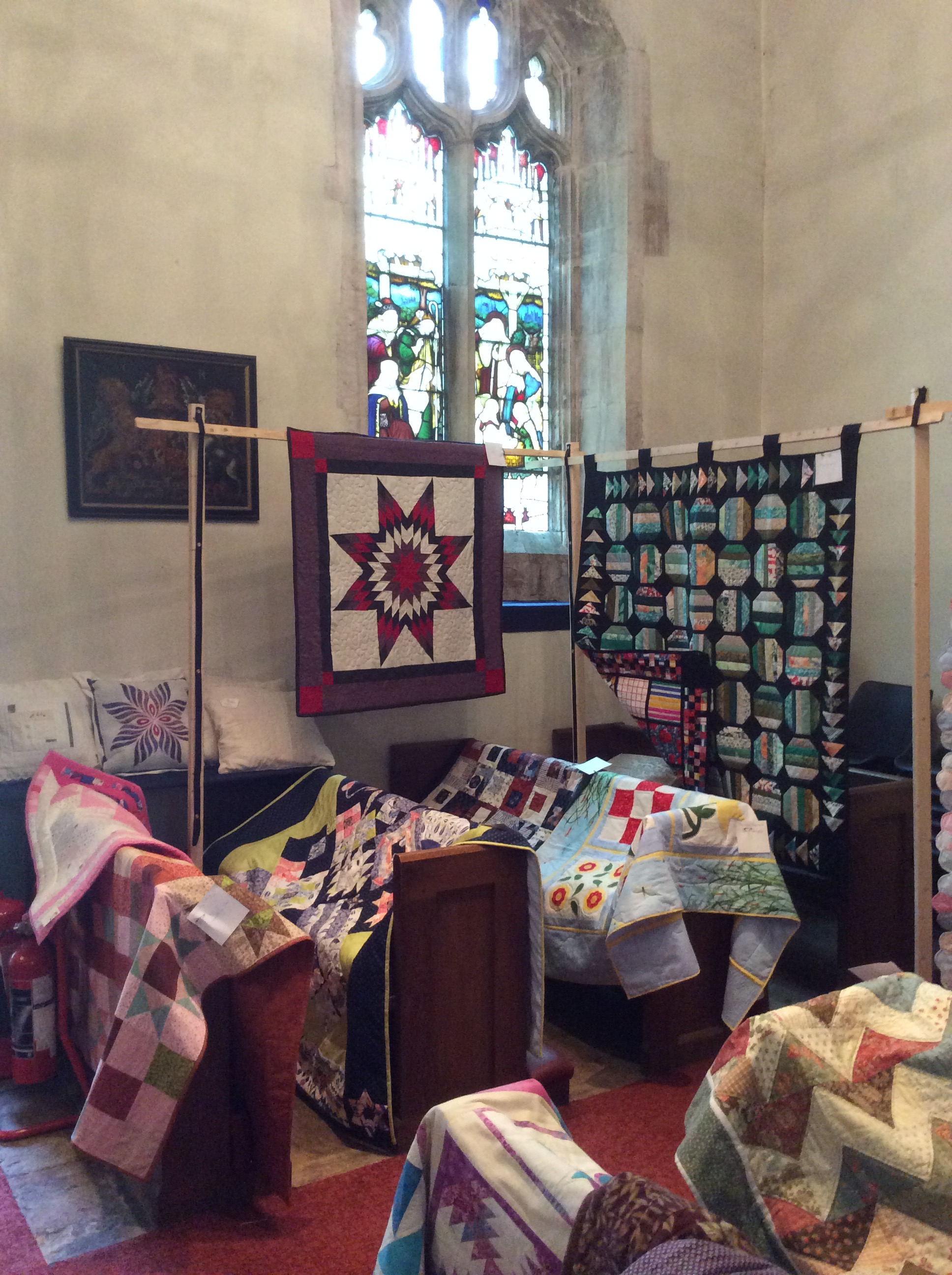 The show was split between two venues with the contemporary work by the CCTG in Cranwell village hall and the traditional quilts by Crafty Ladies on quilt stands and draped over the pews in the beautiful village church. The following photos show a selection of the quilts on display in the hall.