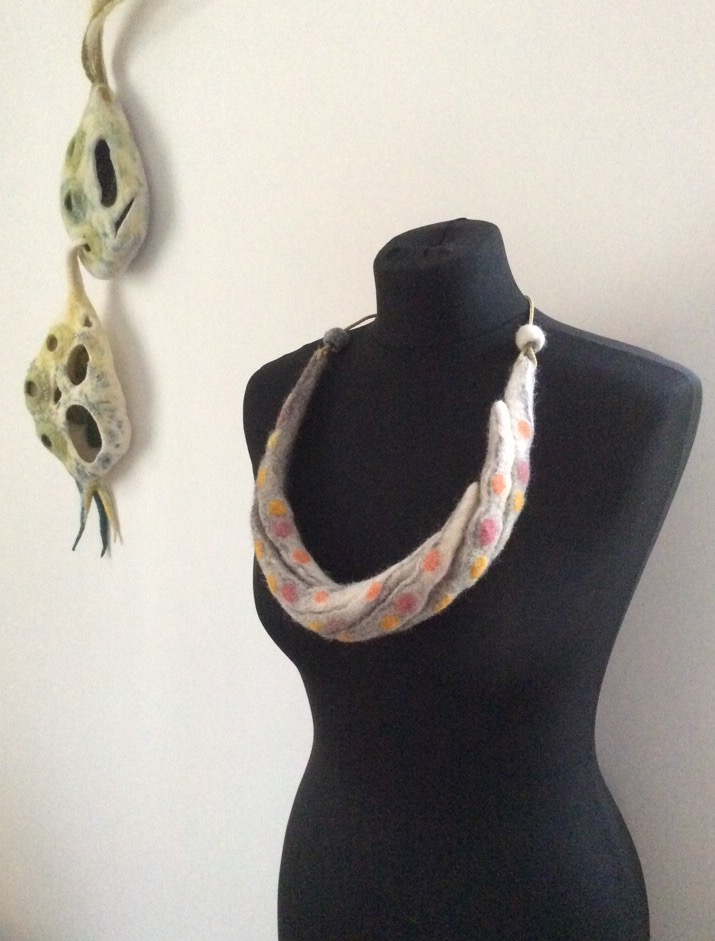 I’ve just finished an experimental piece which was started during Mandy Nash’s workshop in Belchford last weekend. It’s a chunky Bergschaf necklace made from shades of grey and natural Bergschaf wool with yellow, pink and orange spots and hangs from a thin cord.