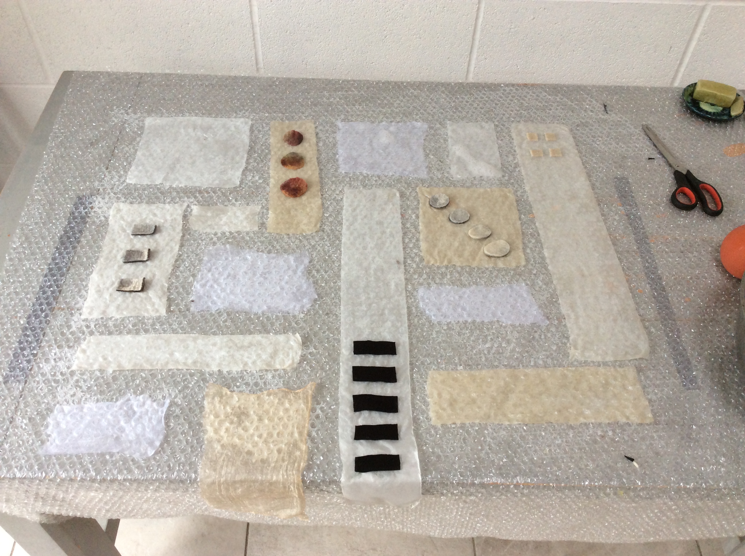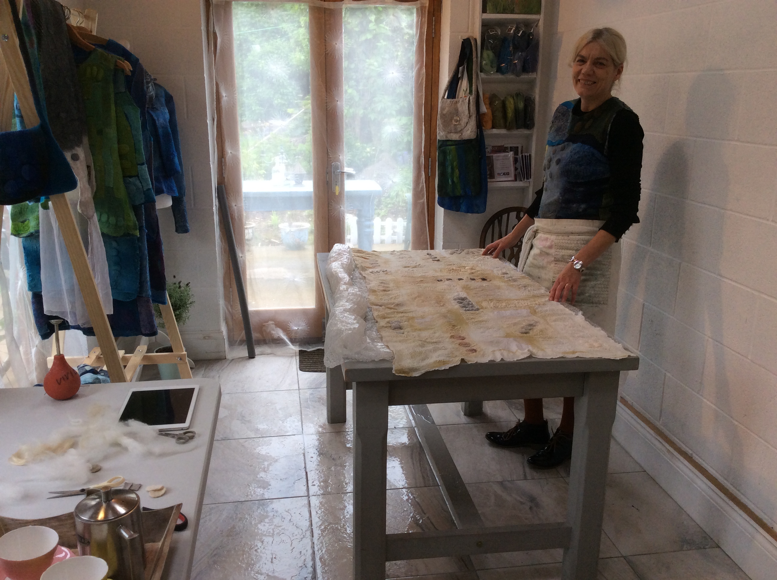 The weather in Lincolnshire has been dull, wet and miserable but I’ve had a fantastic day felting in Barton on Humber at the studio of IFA tutor Vivienne Morpeth. Vivienne creates wonderful Nuno felted wearable art which I saw for the first time back in April and I knew I had to have a workshop with her.