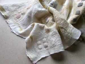 Isn’t it a wonderful effect Marilyn? Some of the inclusions were off cuts from some of Vivienne’s past projects and these felted to the silks. The others, which didn’t felt and so created those beautiful “pebbles”, were cut from boiled wool. I’m looking forward to making the time to do another using bright colours!
