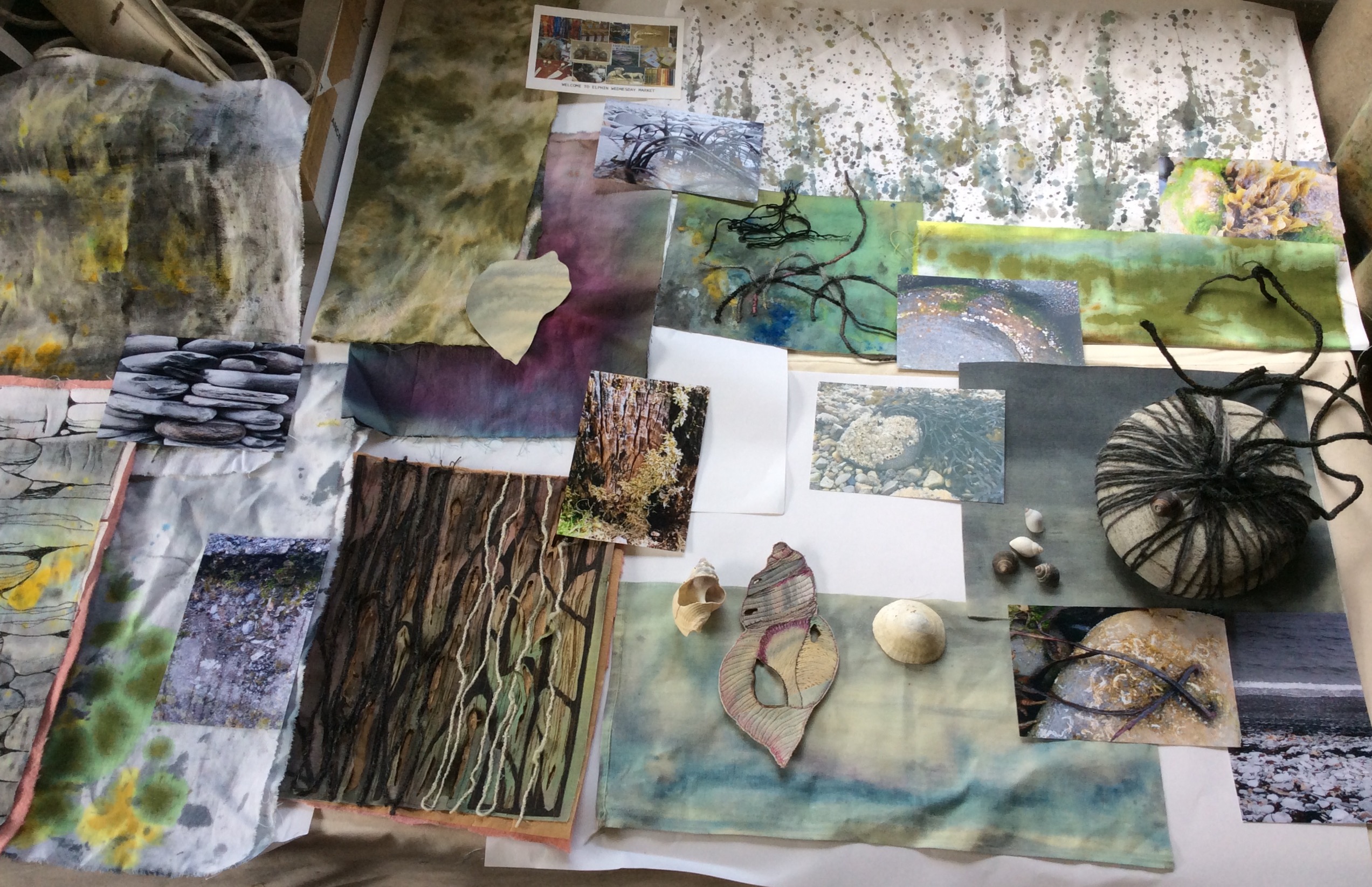 The following day at 10am I met Jan and the 6 other participants in a park down by the beach. After introductions and a brief overview of the workshop Jan sent us off to make personal records of the images, colours, textures and patterns from Ullapool’s beach and harbour and from the open and sweeping pebble beach at neighbouring Ardmair.