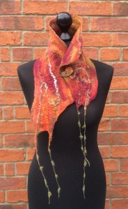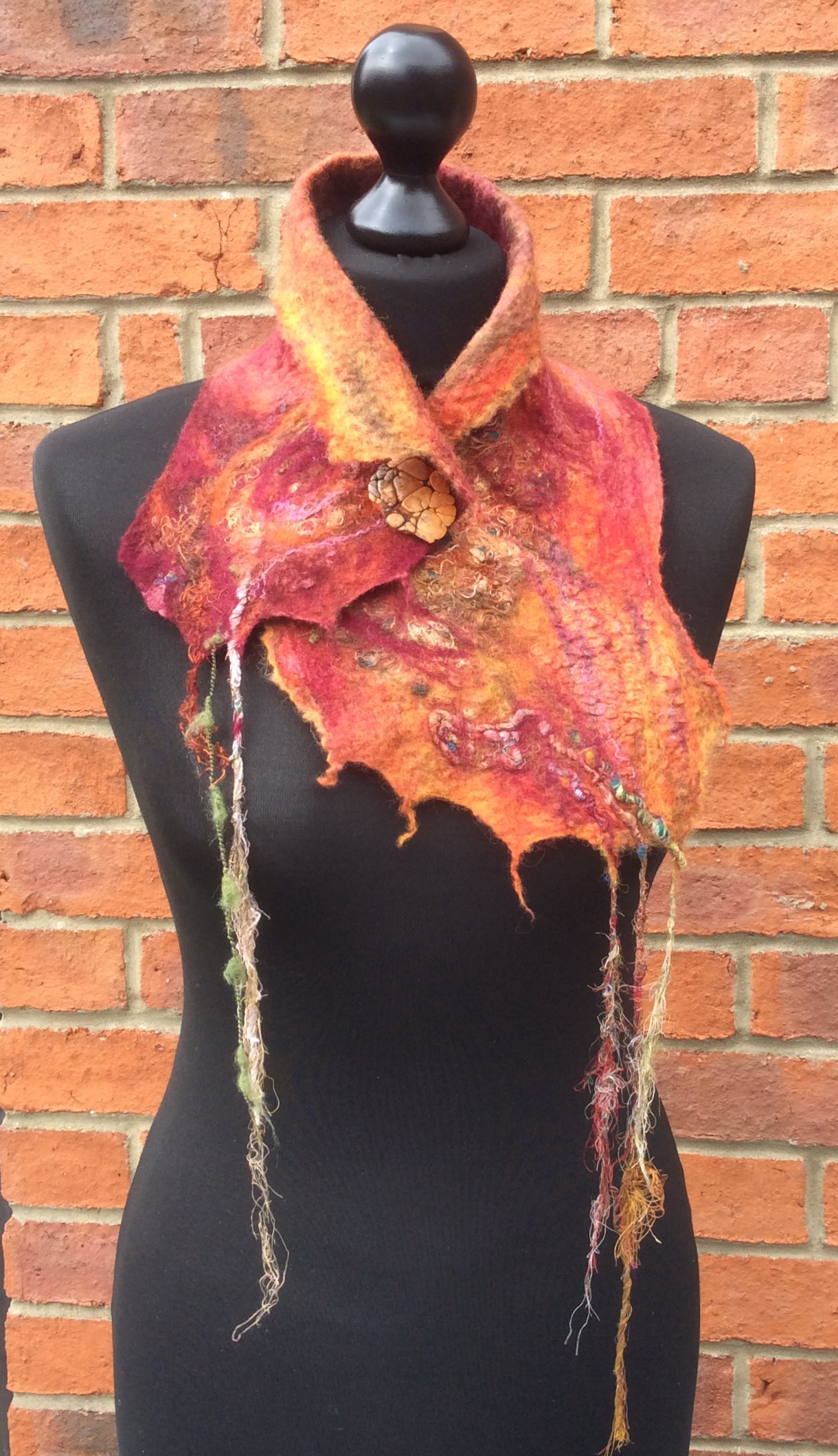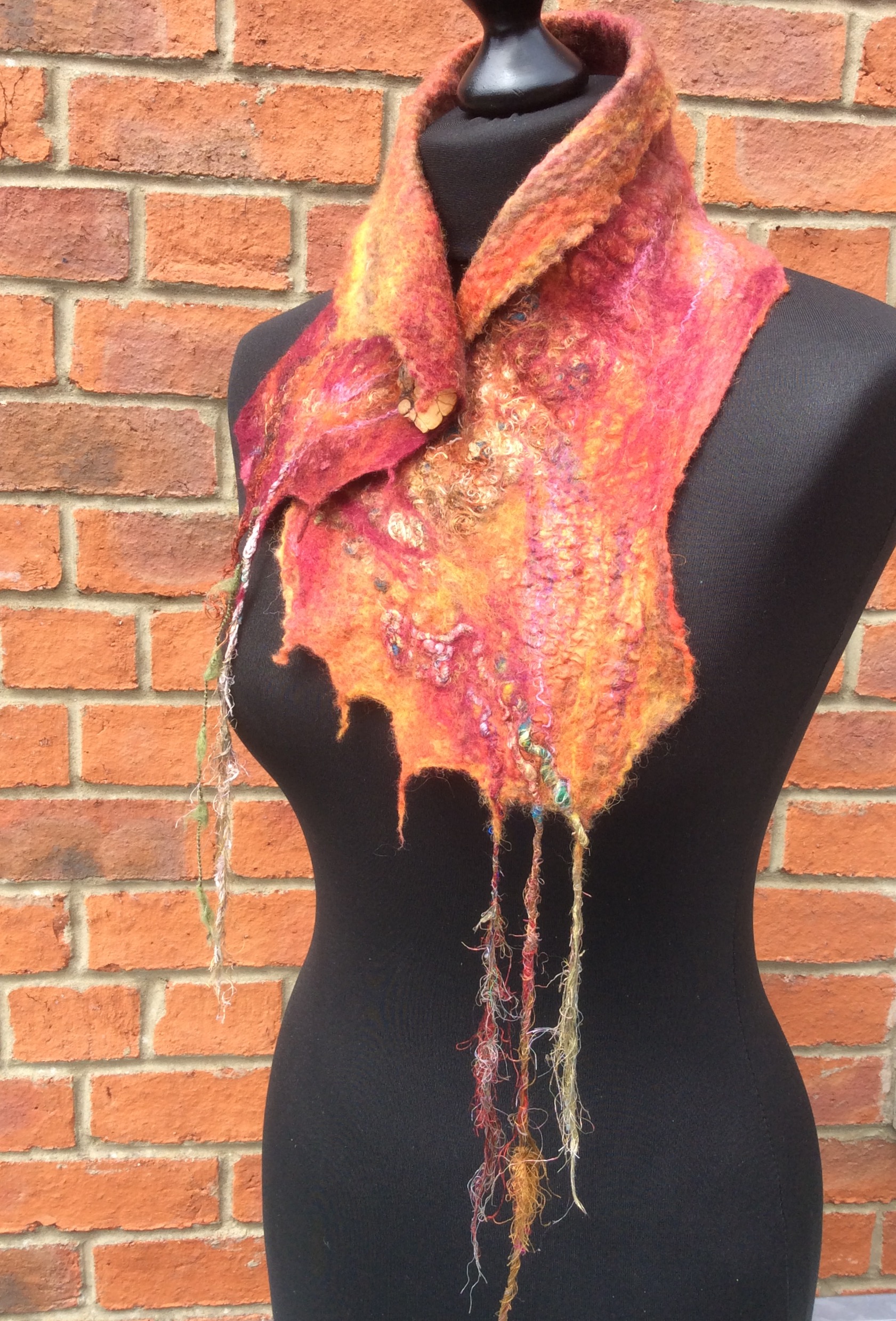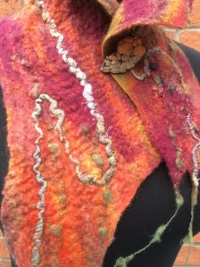 I’ve been busy making samples for a Nuno Collar Workshop which I have been asked to do at the Thomas Garrett Rooms in Heighton in the Autumn.   I deliberately steered myself away from my usual pallet of greys and muted colours and I’m really pleased with the results.  These collars are incredibly lightweight (approx 35gms) making them very comfortable to wear.  Each one is held in place with a Tyvek brooch.