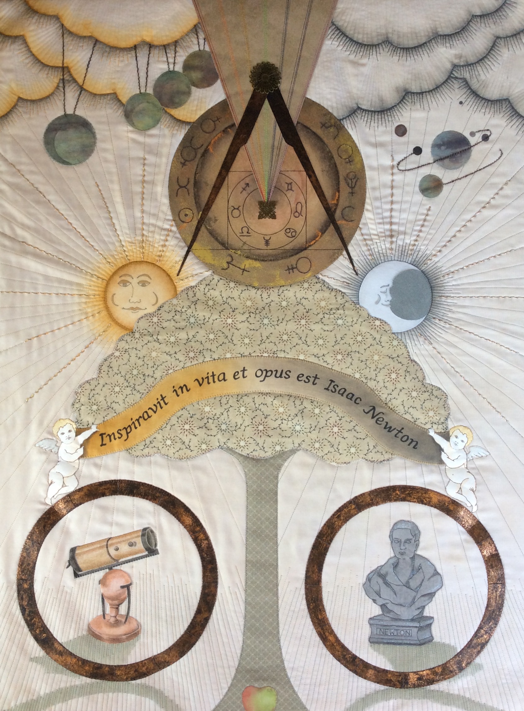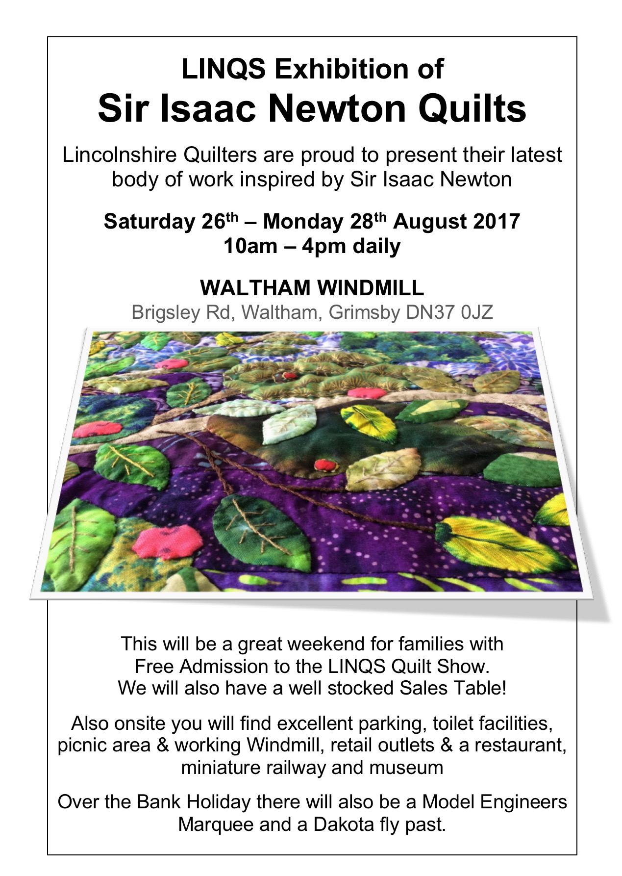 One of the textile groups I belong to is LINQS (Lincolnshire Quilters) and each year we respond to a challenge to make an art quilt based on the life or works of a particular person. Our latest challenge was inspired by Sir Isaac Newton and the work will be on display over the coming bank holiday weekend at Waltham Windmill. The exhibition is free and we will be having a sales table and demonstration area. There will be lots of other things going on at the working Mill with shops, cafes, picnic area, miniature train rides and a model engineers marquee, etc so a great venue for a family day out!