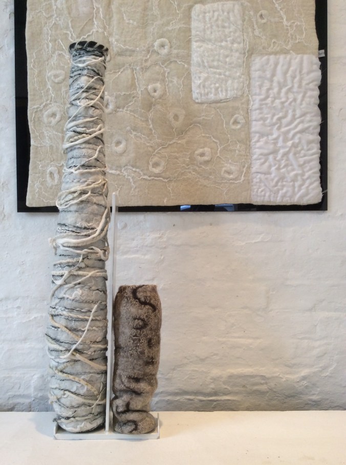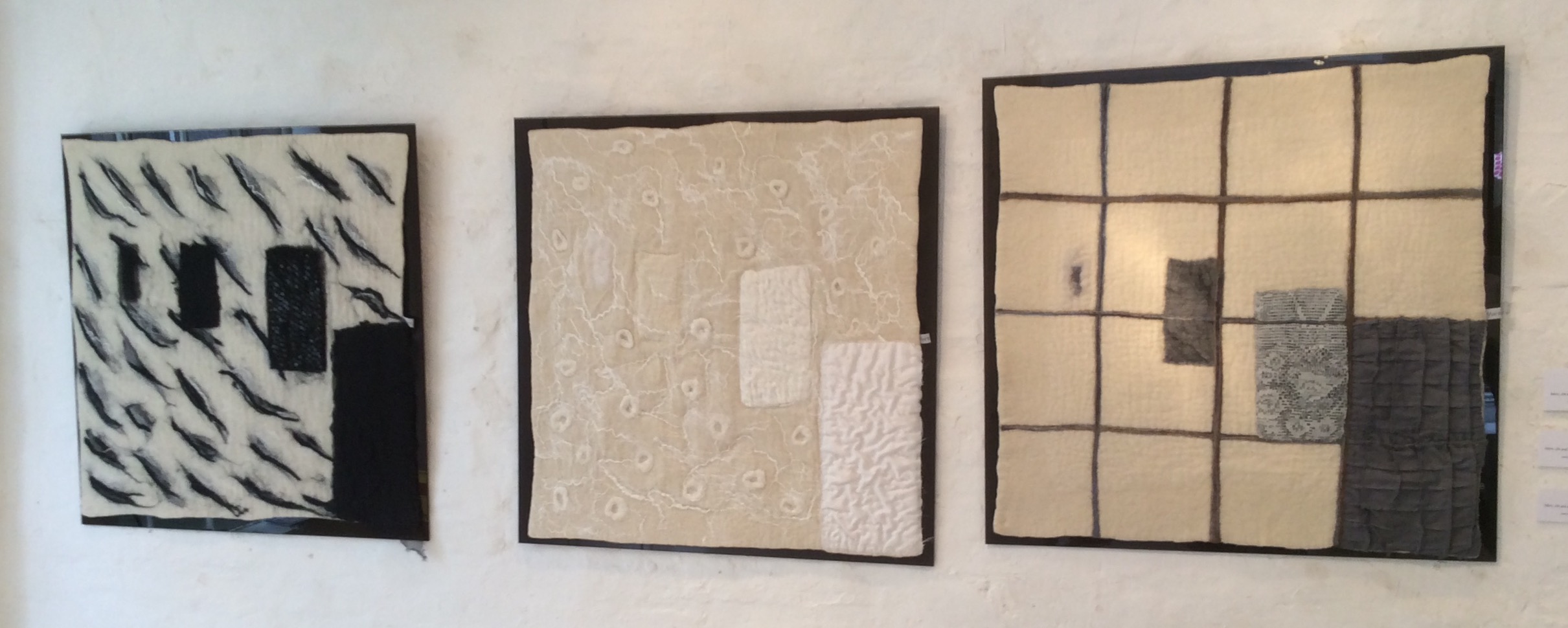 Yesterday I went into Lincoln to see the Re-Action exhibition by Feltmaker Moira West being held in the Gallery at St Martins in Hungate. This little gallery hosts a regularly changing programme of art exhibitions from emerging and established artists and I was keen to visit on the Saturday as Moira was going to be there in person. It’s great to have the opportunity to view creative work of any kind when the artist is in residence to talk about how it came about and answer any questions you might have. Moira said she “was delighted to be invited by gallery manager and artist Phil Bowman to produce my fibre art for another solo exhibition. This body of work will stretch me artistically, whilst also allowing a continuing interpretation of human strength and weakness – a recurrent theme of my work.”