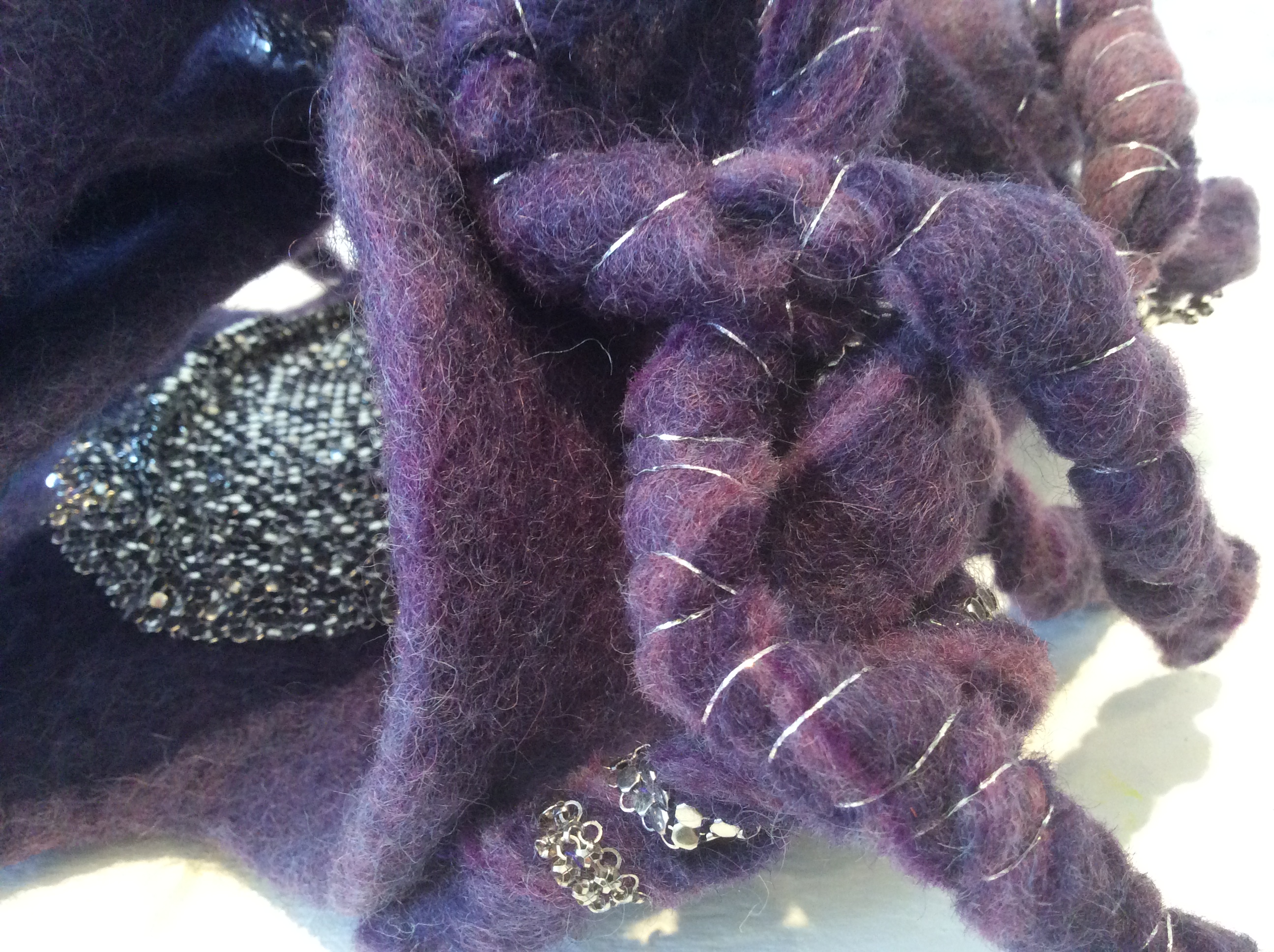 Moira’s work cried out to be handled as it is wonderfully textured and tactile. My favourite piece is the tall grey vessel entitled “Hallelujah – Leonard Cohen” from a collection inspired by singer song writers. The piece below is a detail from “Purple Rain” which combines steel mesh with British wool.