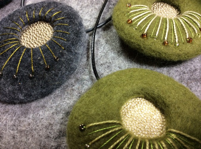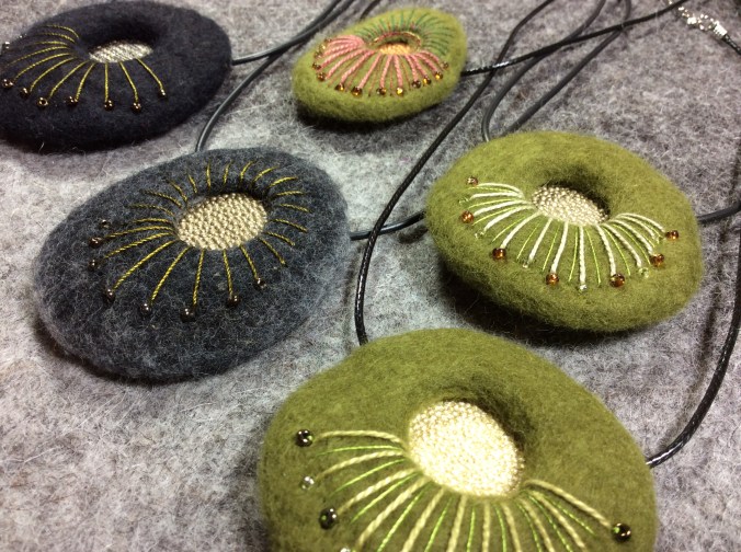 The reason I had hung on to them in the first place is because they are so beautiful, but I couldn’t see the point in putting them back in the drawer if I didn’t have a use for them……so I needed to find one! The result is this collection of wet felted, hand embroidered pendants with acrylic inserts.