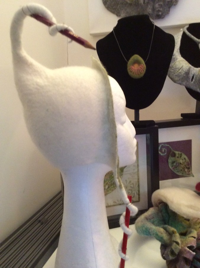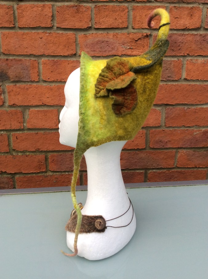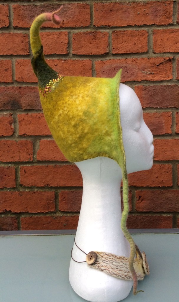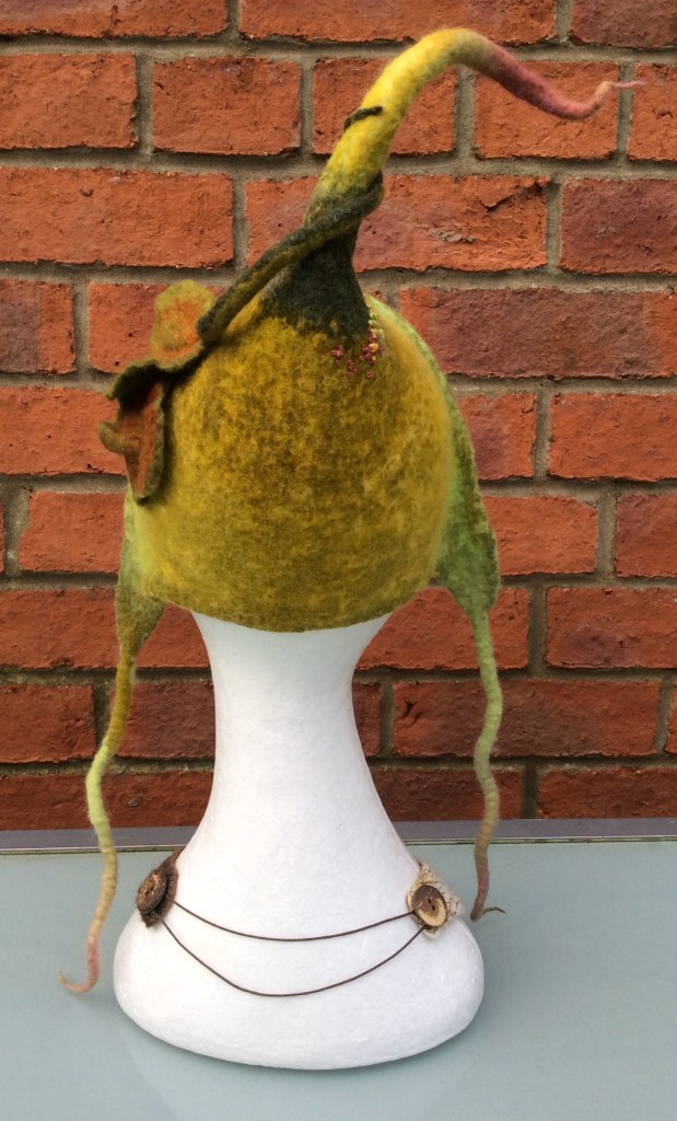 Normally you would colour wool using acid dyes but for this hat I experimented with a combination of Inktense and acrylic paint, both of which are colourfast once they have dried. I found that when the acrylic paint is sufficiently watered down it will not clog the wool and it retains its soft handle. The only area where I painted it on thickly was at the base of the top “tail”…..I wanted this to be stiffened and the paint certainly did the trick! The Inktense didn’t seem to affect the handle of the wool at all.
