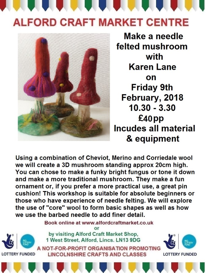 I’ve just been informed that we still have spaces left on my Needle Felted  Mushroom Workshop which will be held in Alford on the 9th February.  This workshop is suitable for absolute beginners as well as those who have experience of felting.  If you would like to book please contact the Alford Craft Market via their website http://www.alfordcraftmarket.co.uk or call Lynne on 01507 463341.
