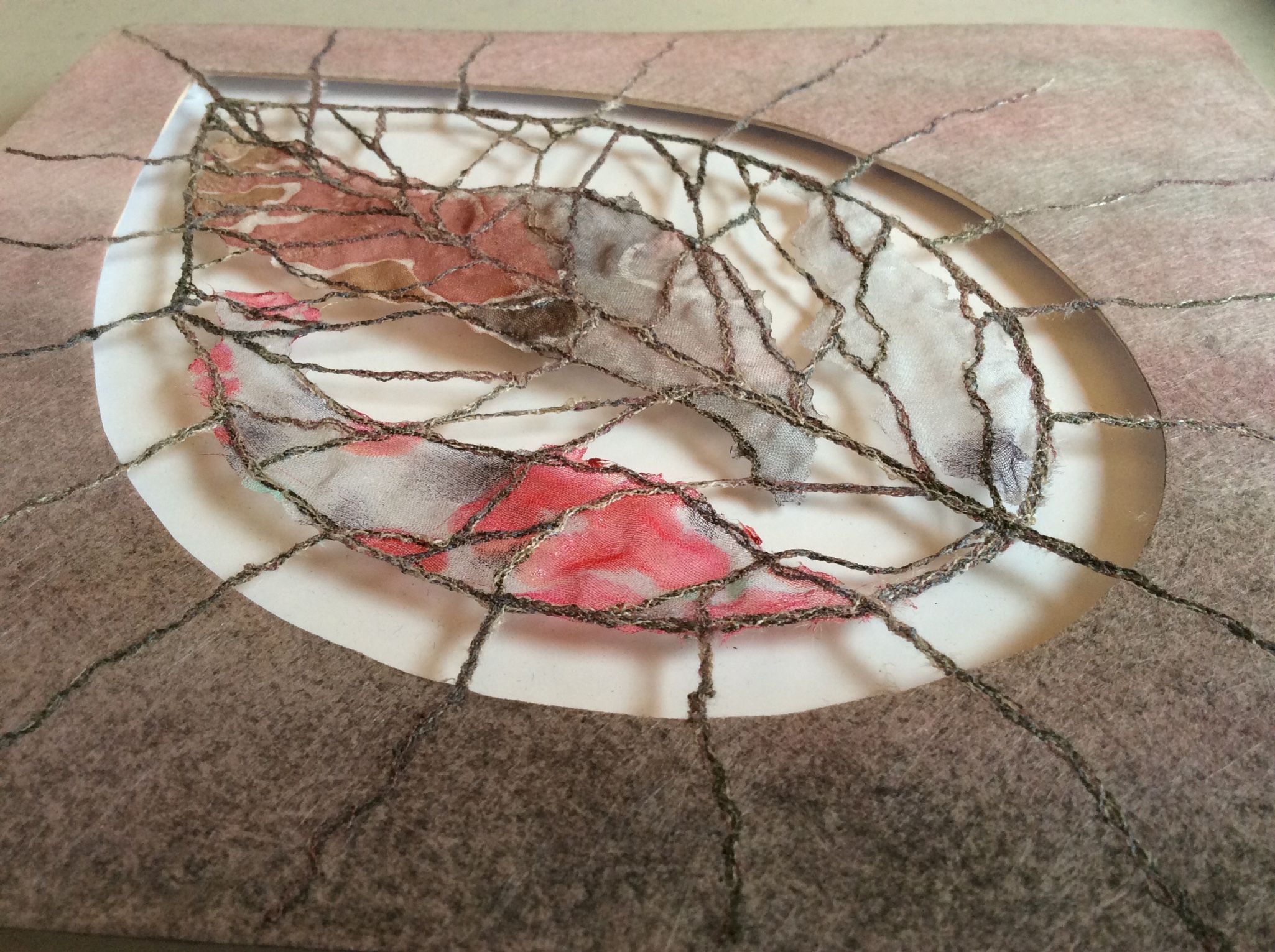 a free motion stitched leaf has been created using water soluable stabiliser. The leaf has then been joined to a stiffened, painted fabric and appears suspended within a leaf shaped hole in that fabric.
