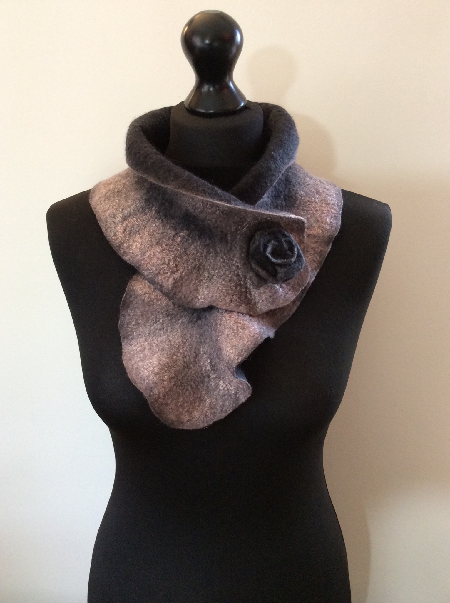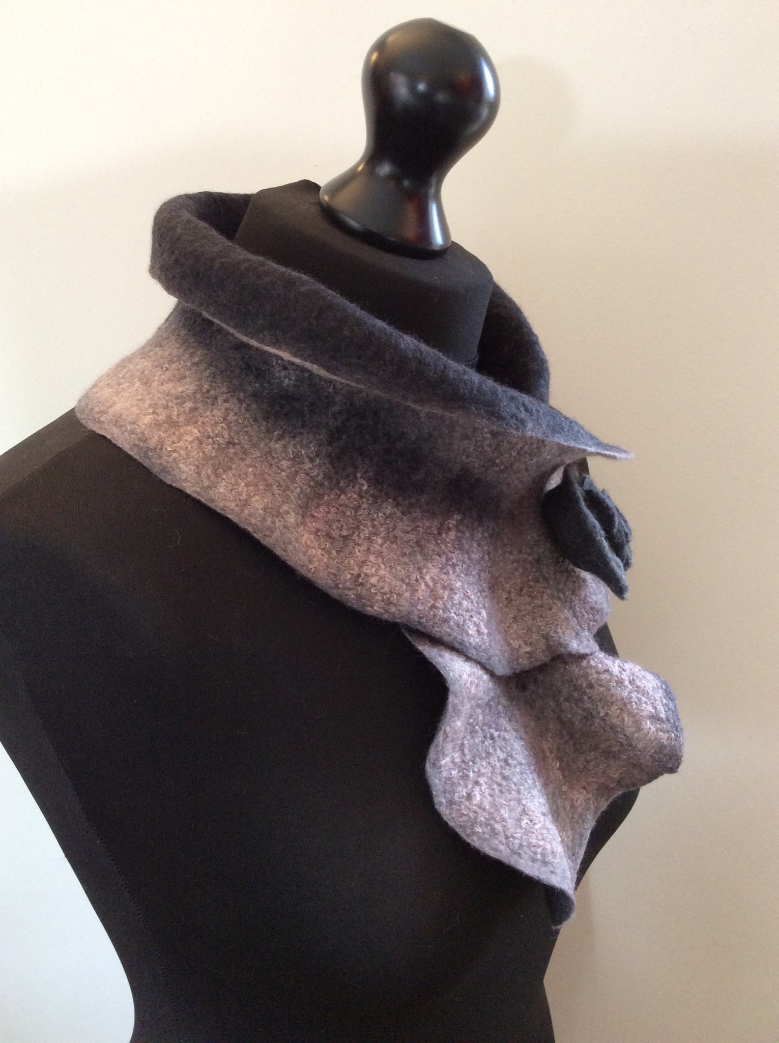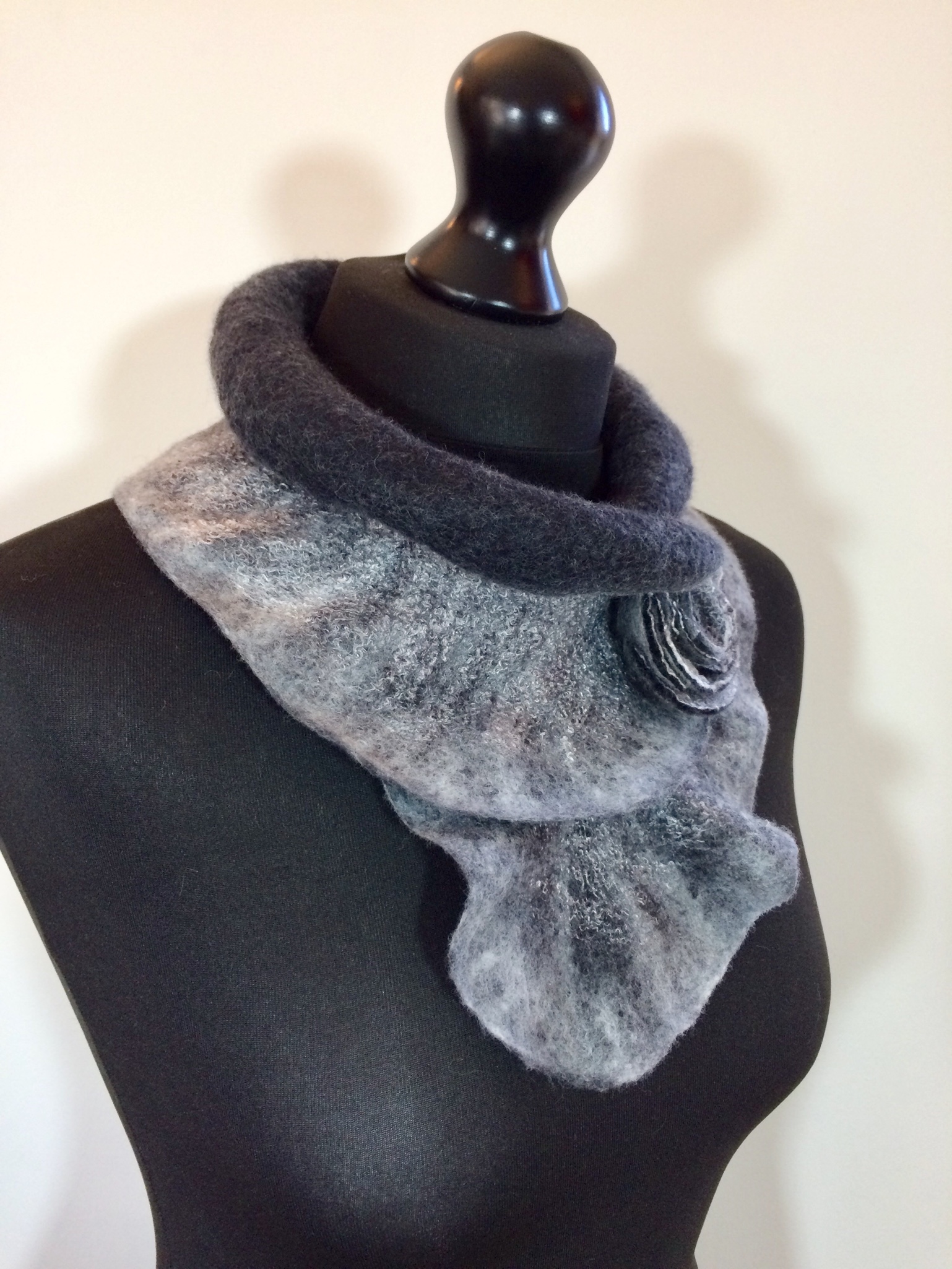 The first grey collar was one of my mystery (unlabelled) fibre blends. It’s a little hairy but extremely soft. It’s the longest of the three which gives it scope for being worn in different ways.