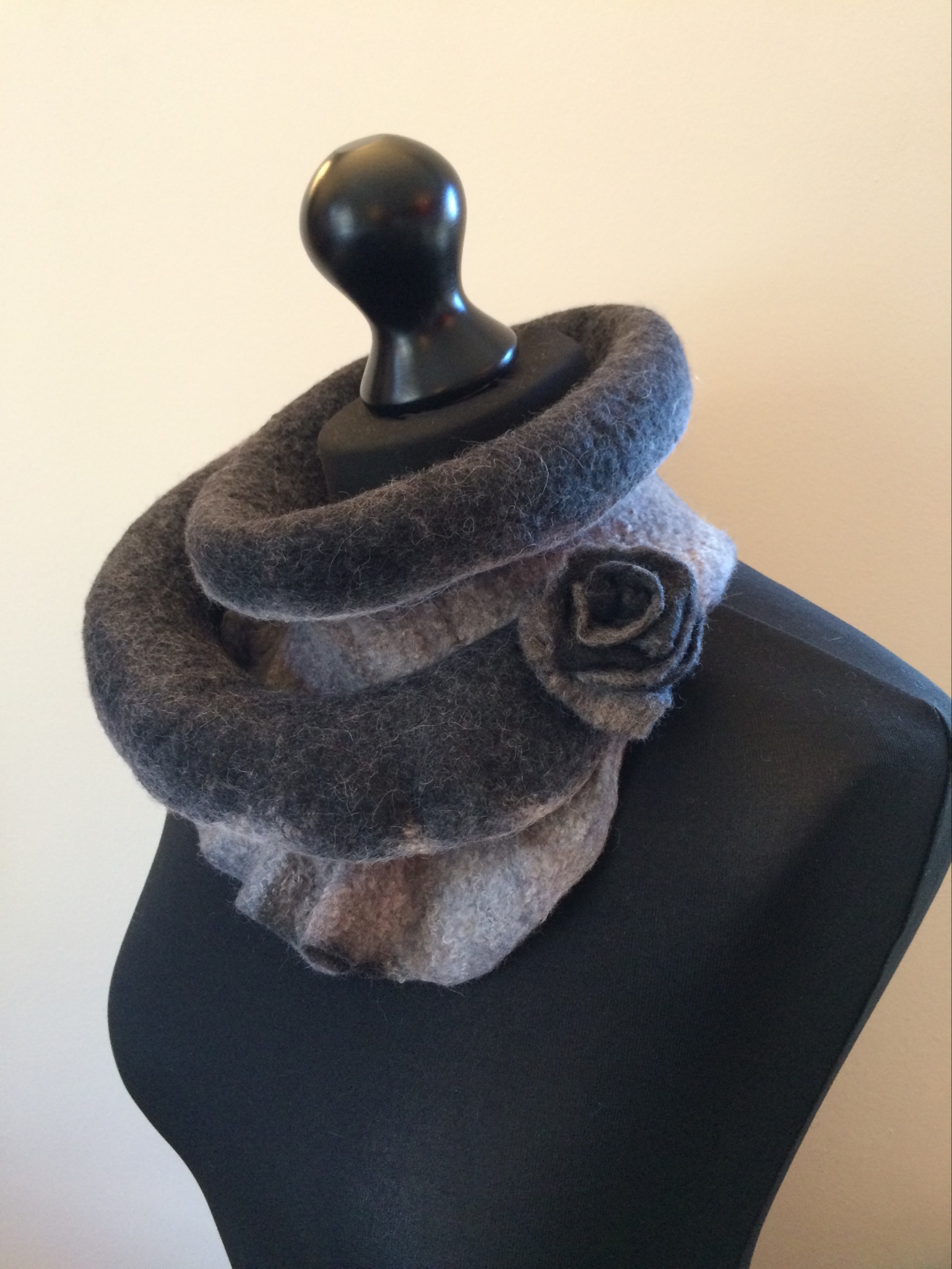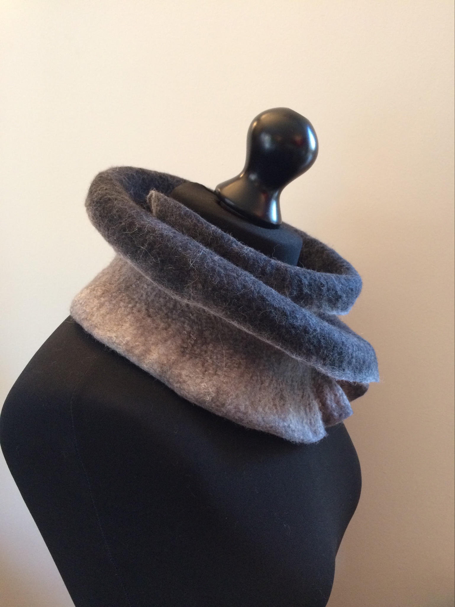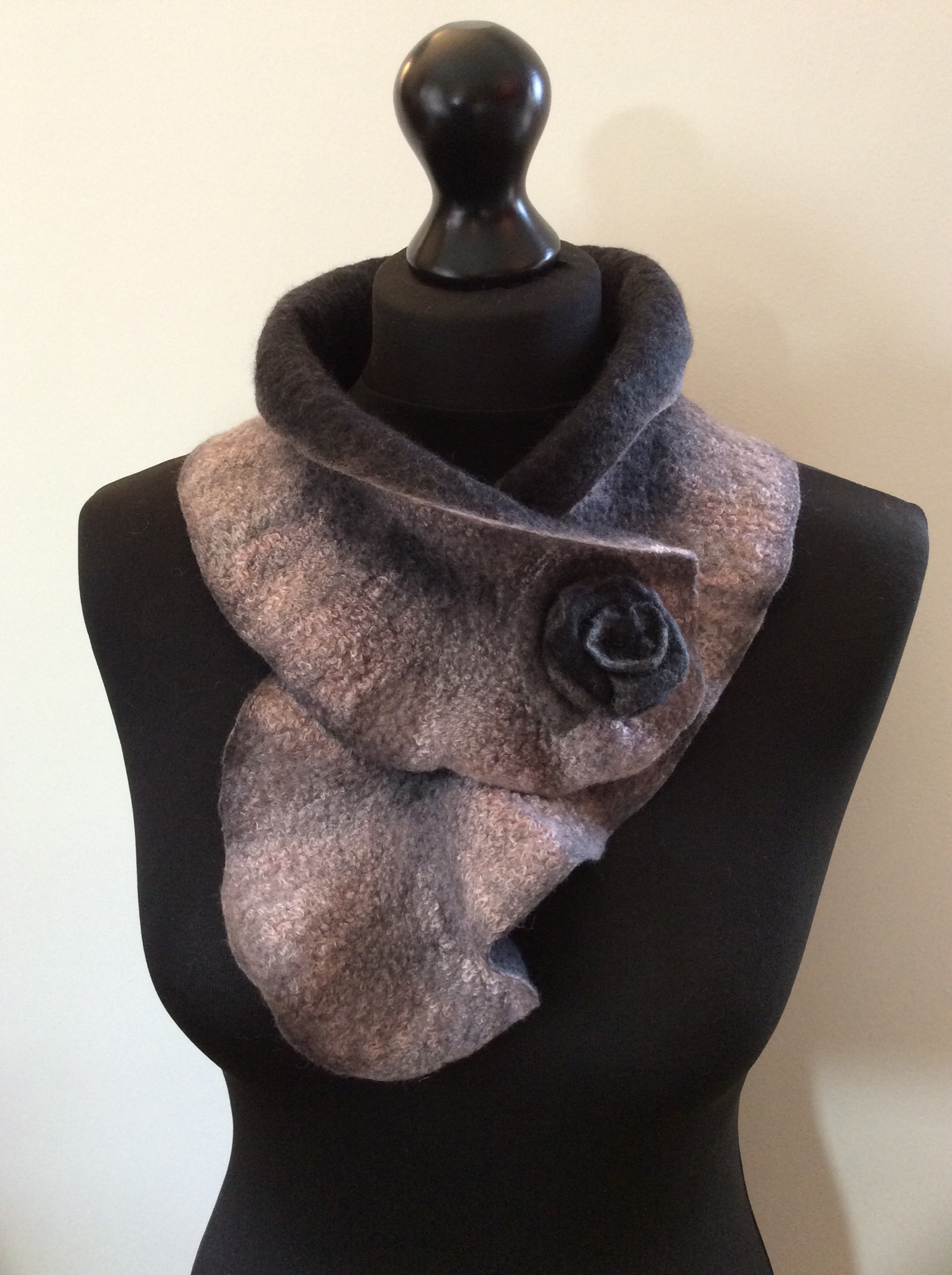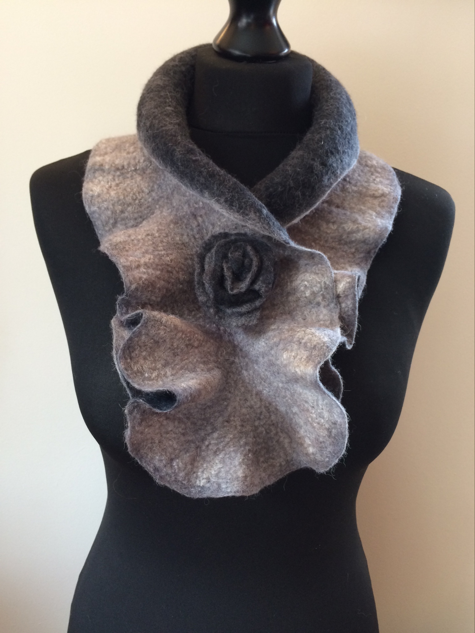 The first grey collar was one of my mystery (unlabelled) fibre blends. It’s a little hairy but extremely soft. It’s the longest of the three which gives it scope for being worn in different ways.