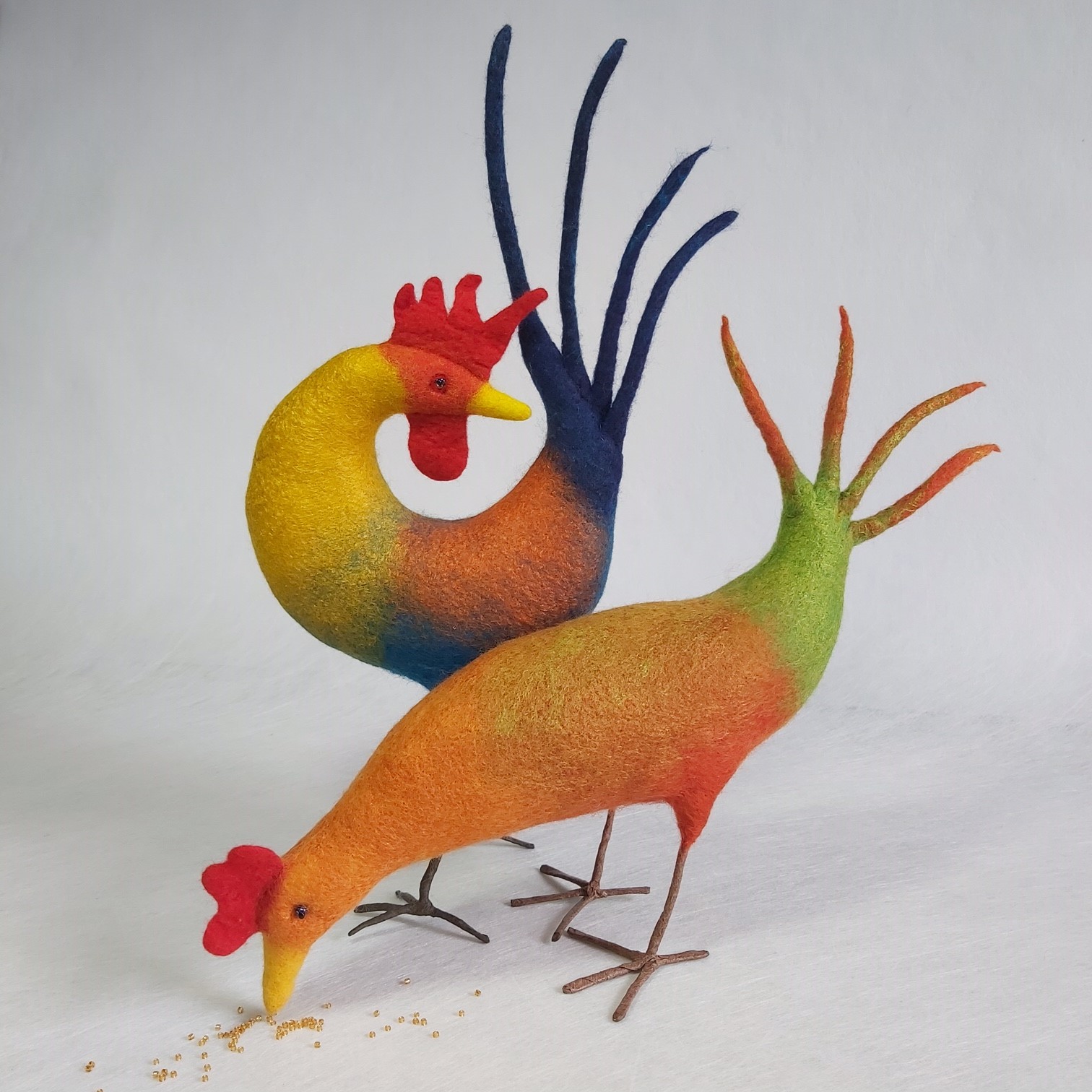 A cockeral & a hen, 3D wet felted using Merino fibres. The hen is predominently orange and red with a green and orange tail and a red crown. The cockeral is predominently yellow and orange with a blue underside and tail and a red crown and wattle. The hen is pecking at seeds while the cockeral keeps watch over his shoulder.