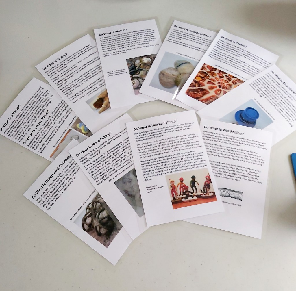 But there’s more to it than that. We also want to show the general public the enormous diversity of what can be done using fibre. We will be displaying 2d, and 3d, wet felting and needle felting, garments, bags, wraps, hats, vessels, bowls, animals, lighting, wall art, and a storytelling diorama. There will be Nuno felt, cobweb felt, differential shrinkage, directional shrinkage, encapsulation, etc. We will also be featuring what we’re calling our “Education Station” – a touchy-feely area full of samples donated by our exhibitors, complete with explanations as to what they are. These will be displayed alongside a range of laminated “So What Is” info cards explaining a variety of terms such as …..So What Is Nuno Felt? So What Is Differential Shrinkage? So What Is Encapsulation? Etc, etc.
