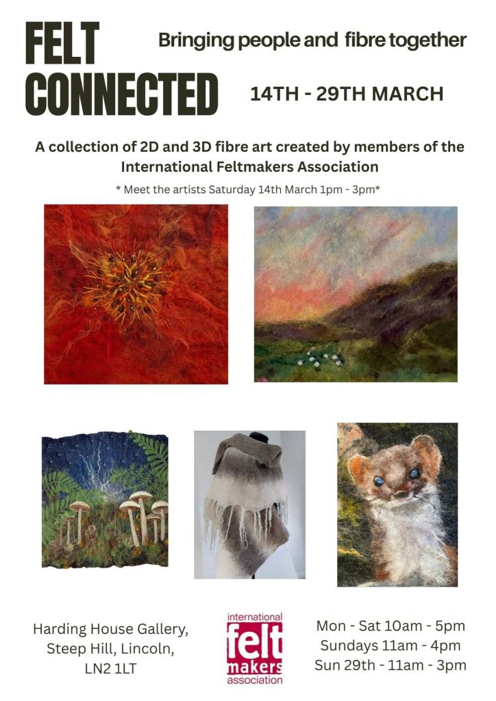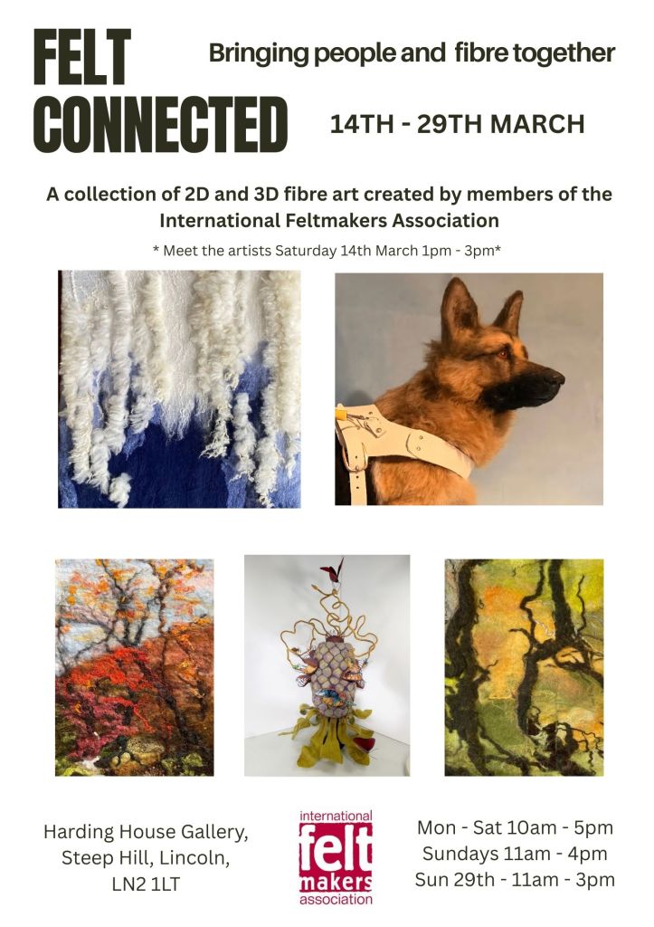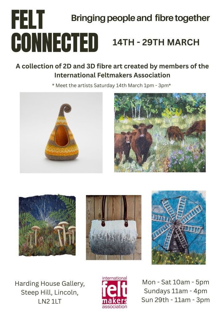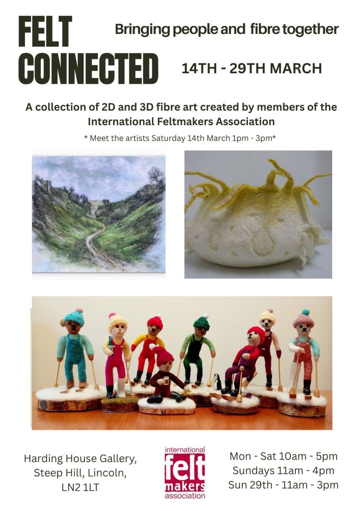 The suggestion for the event came from Lincoln based Feltmaker Jo Cook who also went on to produce and distribute our exhibition posters. Jo wanted each member to have a piece of work on a poster so made several different versions which have been circulating for the past couple of months. This seemed a far better idea than trying to cram 18 tiny images on to one A4/A5 poster!