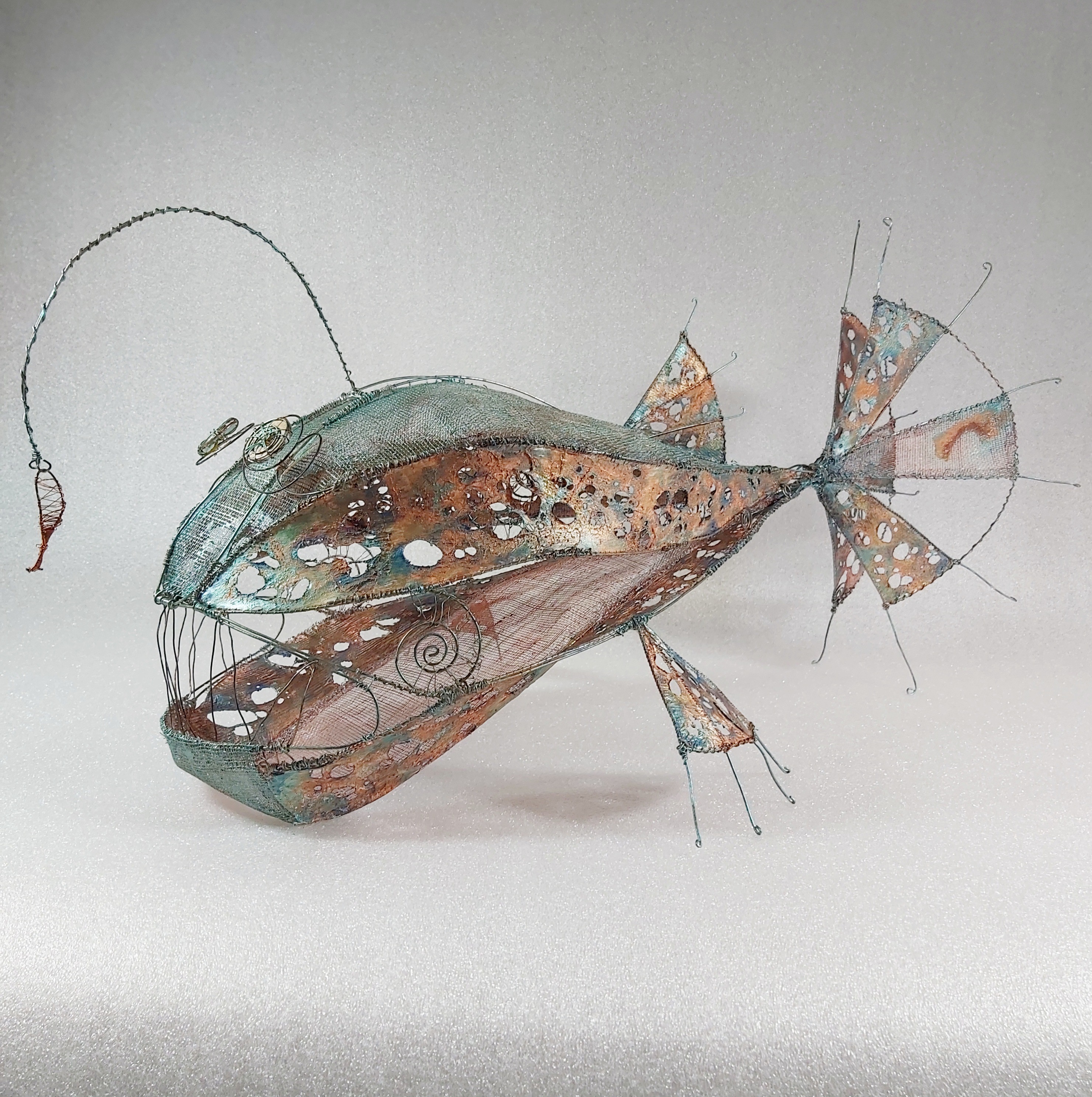 A 3D angler fish dangles her bait and waits for the catch! I created a wire armature and hand stitched sinamay and Tyvek fabric to it. The fabrics were painted in shades of turquoise and bronze and the Tyvek was distressed using a heat tool to create holes. Approx 64cm long x 30cm high x 37cm wide.