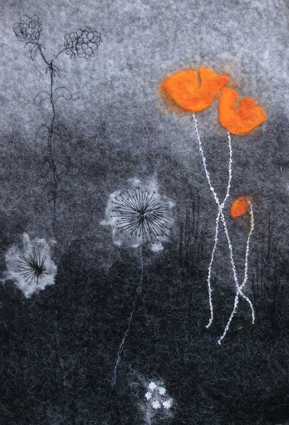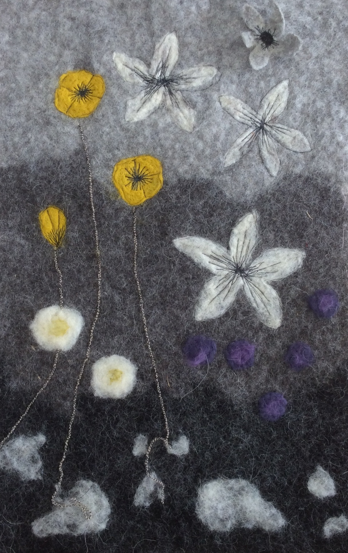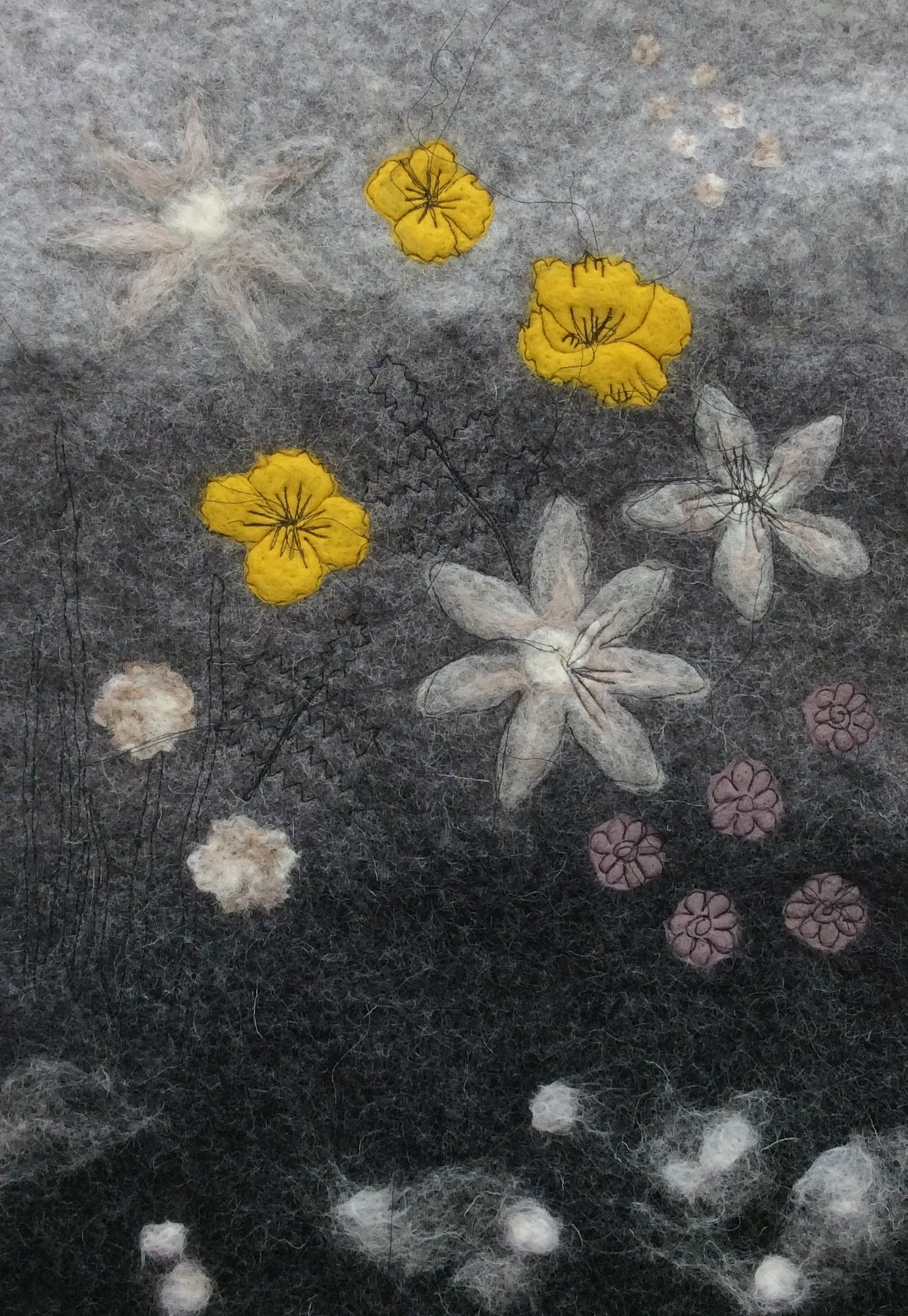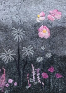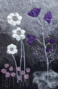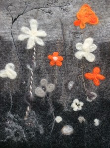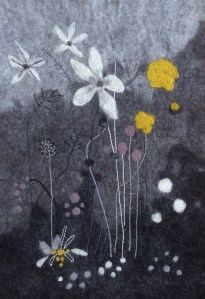 I attended another of Eve Marshall’s fabulous felting workshops just before Christmas and this one, following on from the Elf on a Toadstool with Robyn, was perfectly timed to feed on my reawakened childhood love of all things magical/mystical. The basic process for making the body of the wet felted Fairy was very similar to that of making a flower i.e. laying the tufts of fibres overlapping in a ‘starburst’ formation. One thing to remember before commencing the felting is that the centre of the ‘flower’ will become the Fairies head and therefore the fibre laid here should be your chosen ‘flesh’ colour.