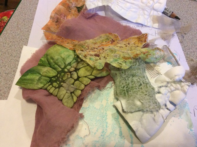 The group was keen to try out techniques they hadn’t used before and had fun with the heat tool and soldering iron, distressing polyester fabrics, Lutradur and Tyvek as well as painting and layering their fabrics.