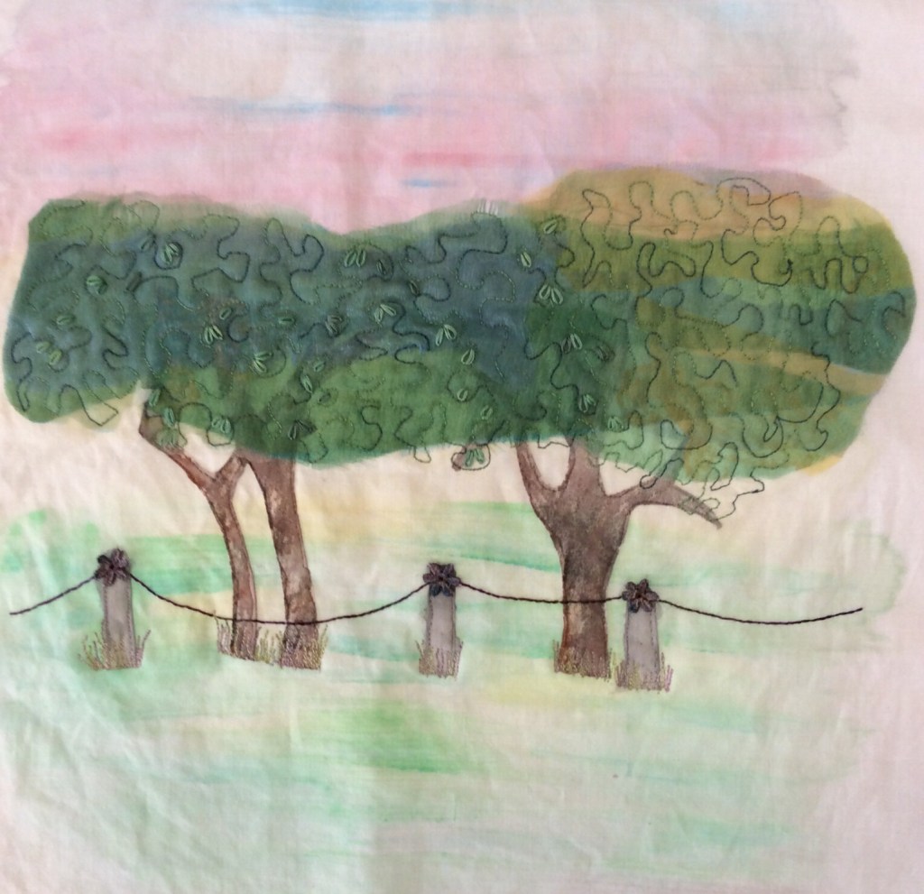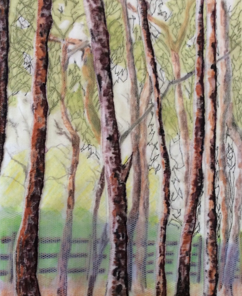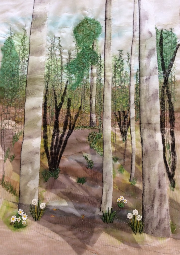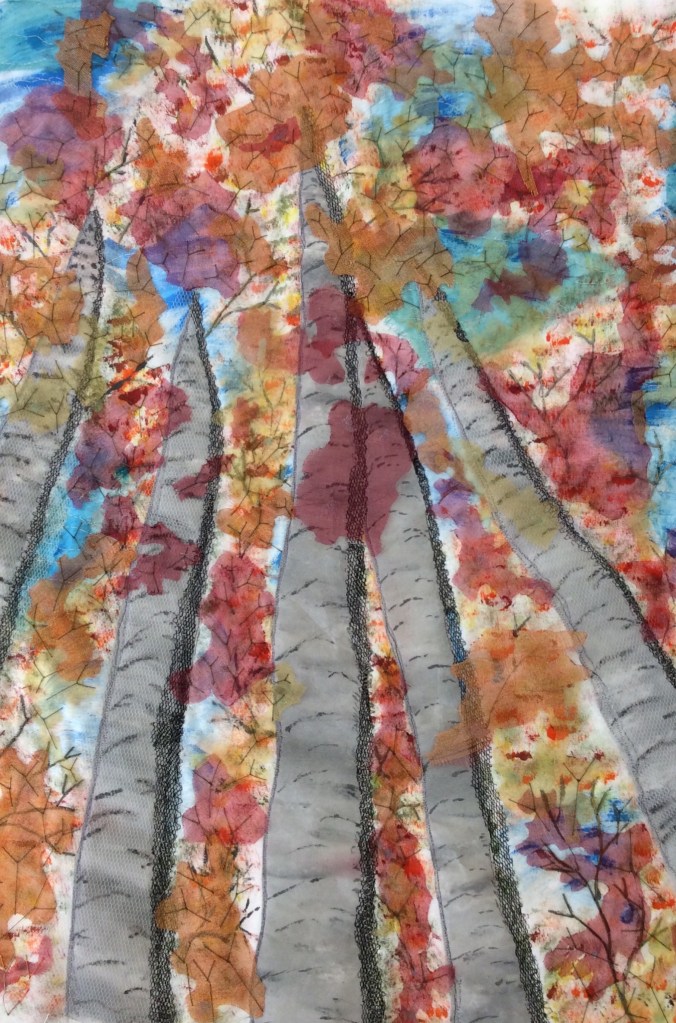 Its been several months in the making but I’ve thoroughly enjoyed working on it using a combination of free motion stitch, hand embroidery, recycled fabrics and coffee capsules, sheer fabrics, hand painted silk fabrics and machine wrapped cords. The more I embellished the further it shifted from being about single slab of rock to becoming more about the ocean in general with its abstract rivulets of water, seaweed, coral and the obligatory rock pools. Approx 90cm x 50cm.