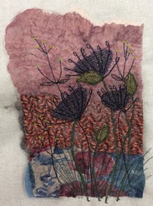 Time spent walking in the beautiful Northumberland landscape, particularly around the Coquet Valley and Simonside Hills, provided the inspiration for Northern Soul. It was created using a variety of fibres and fabrics, wet felted and free motion stitched on to a painted background of Lutradur fabric.