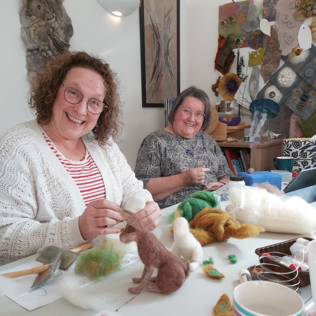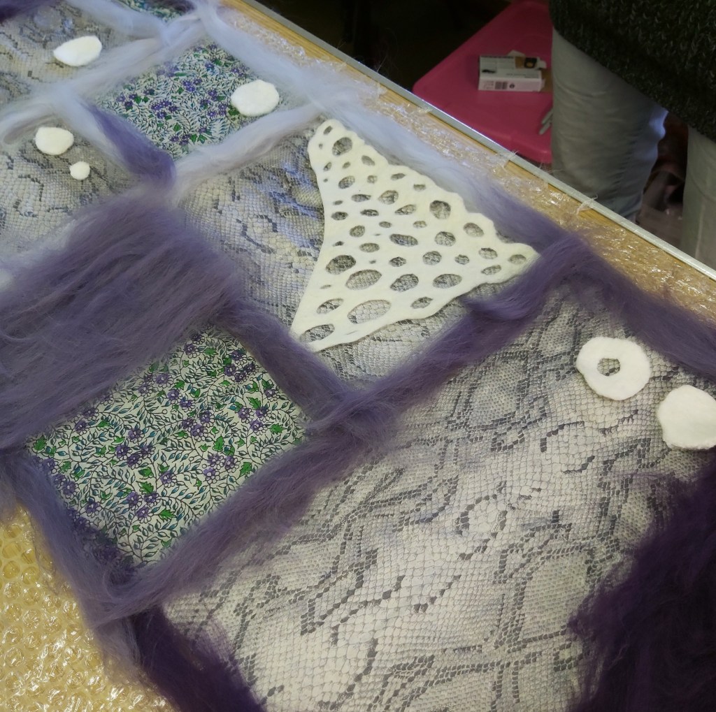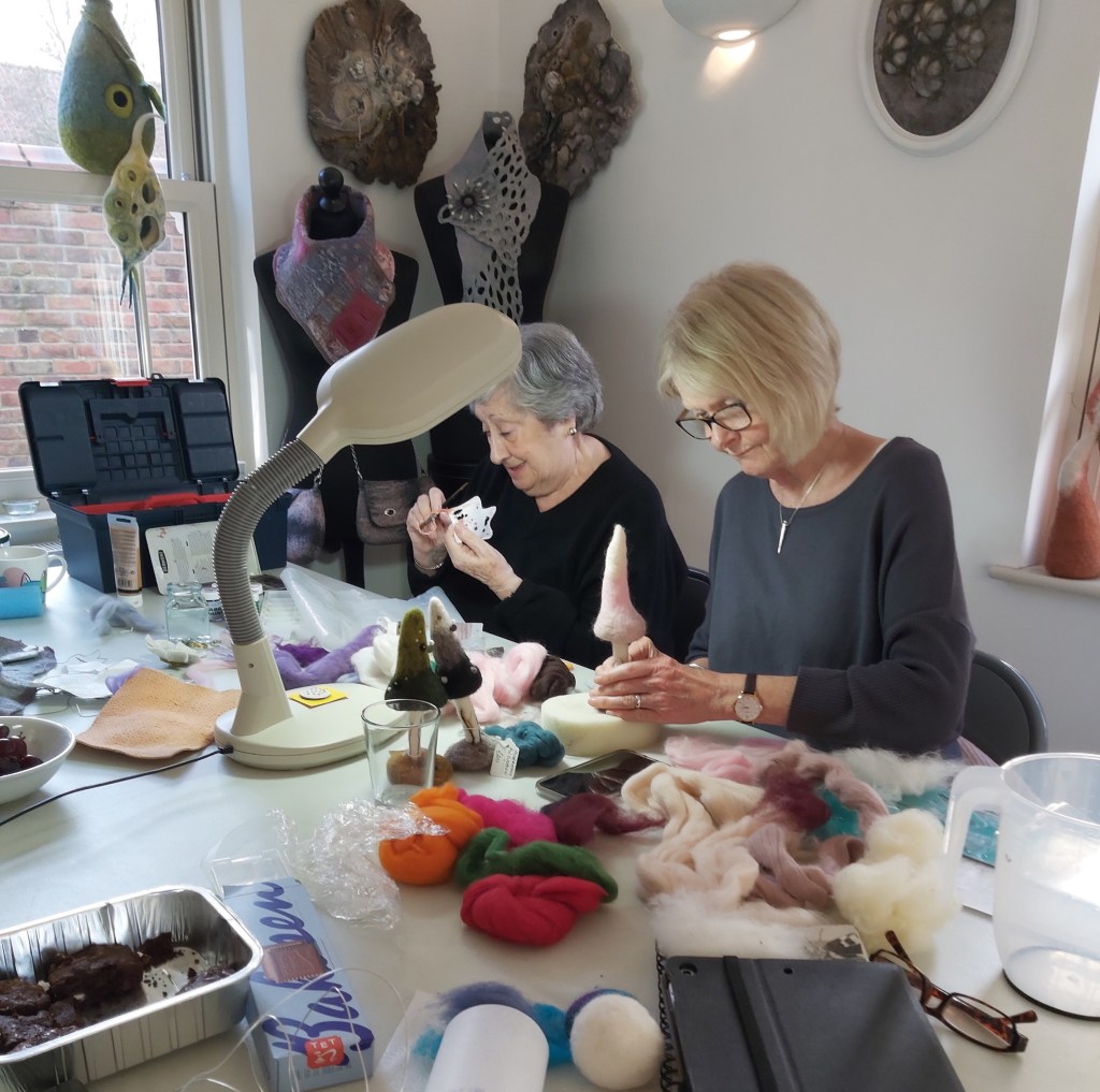 Something I’m doing much more of now is small group workshops in my home studio. These tend to be groups of friends who book together either for a specific project or, as in the case of Margie, Di, Clare and Jacky, each one came with a certain idea in mind and I helped guide them towards completion. These ladies have been several times for wet felting and in February decided to ring the changes with some needle felting and Tyvek work.
