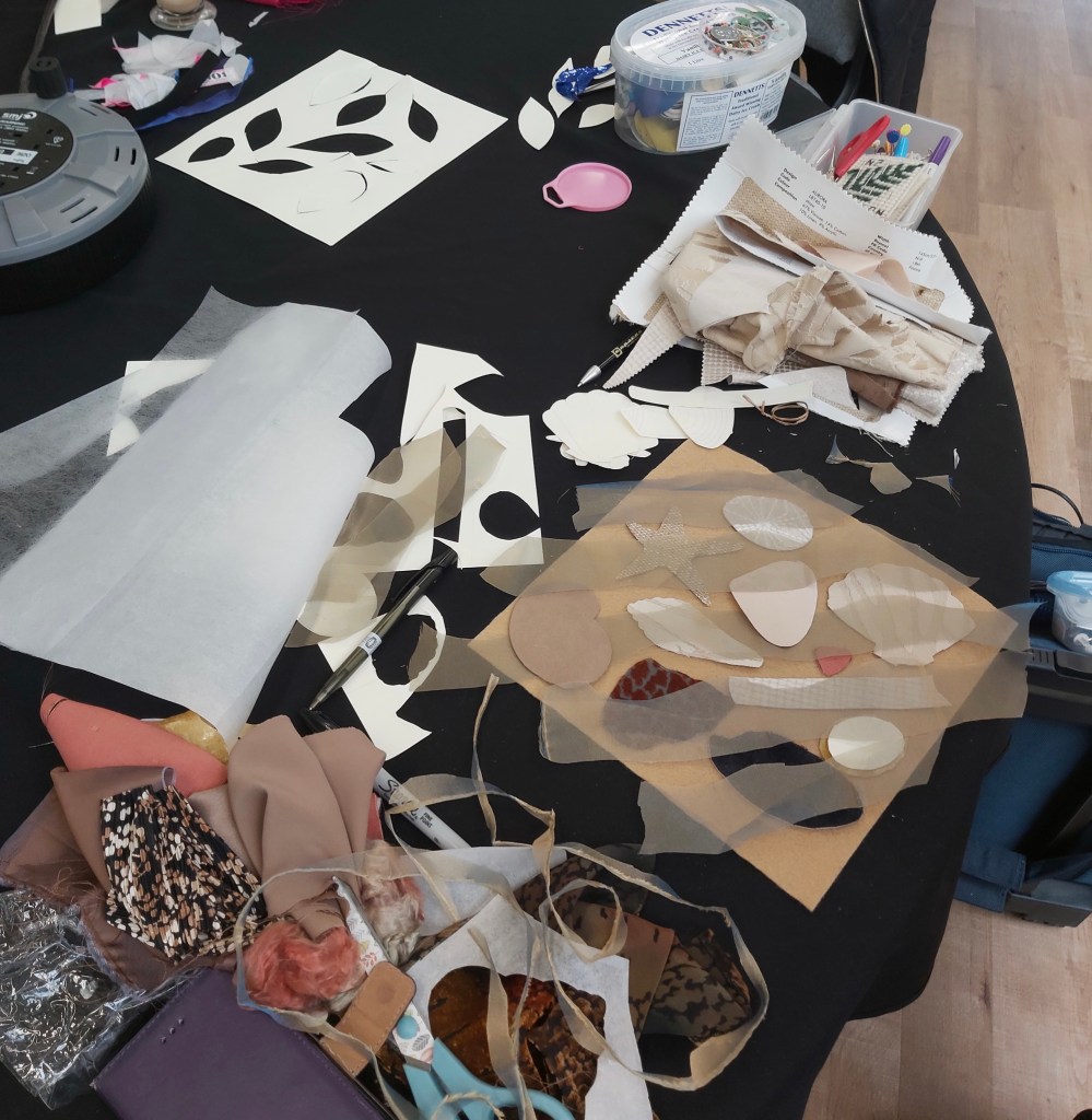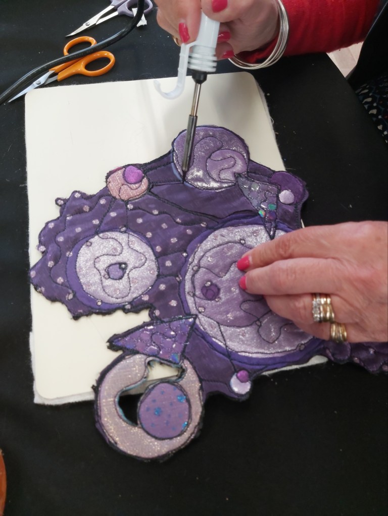 Last month I took Layer, Stitch & Burn to the Sleaford Embroiderers at their monthly gathering at the Hub in Sleaford. This is a fun, experimental workshop using a variety of synthetic fabrics. Techniques include cutting, layering, bonding, foiling and free motion stitching. Finally, once everything is held firmly in place, we burn away our background using a soldering iron & heat tool to leave a lace like effect. Most of the ladies would go on to finish their work at home but here are a few photos of their work in progress.
