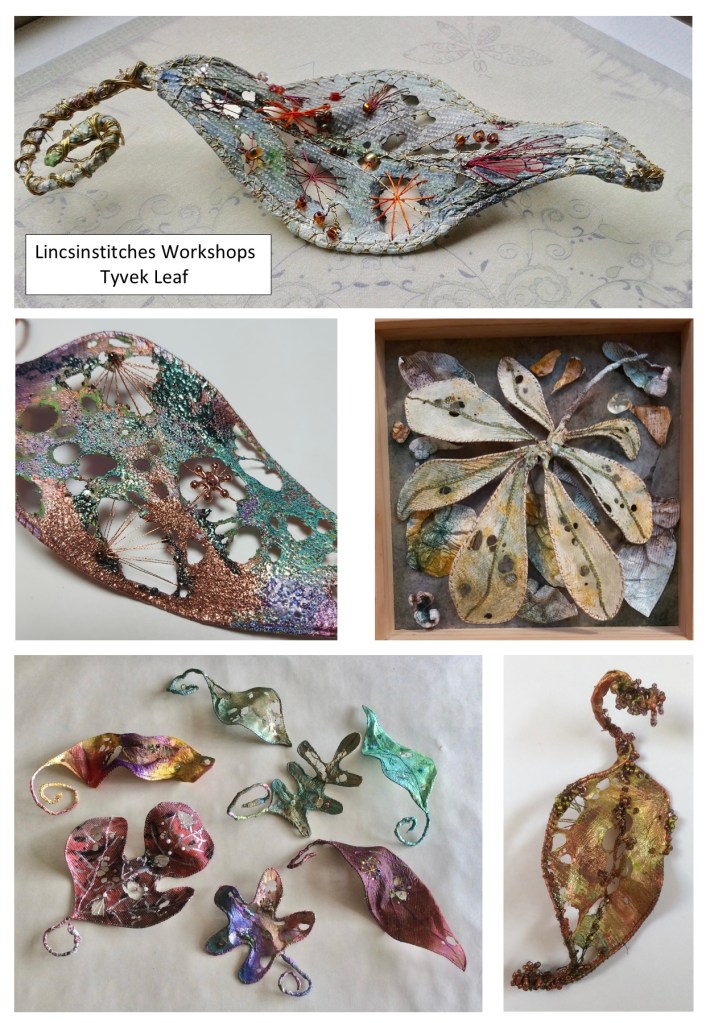 Also in February I visited the Creative Stitchers at Great Coates where we spent the day painting, stitching and heat distressing Tyvek fabric to make our Tyvek leaves and 3D seed pods. I love the fact that, due to the process used, these pieces cannot be repeated so each one will always be totally unique!