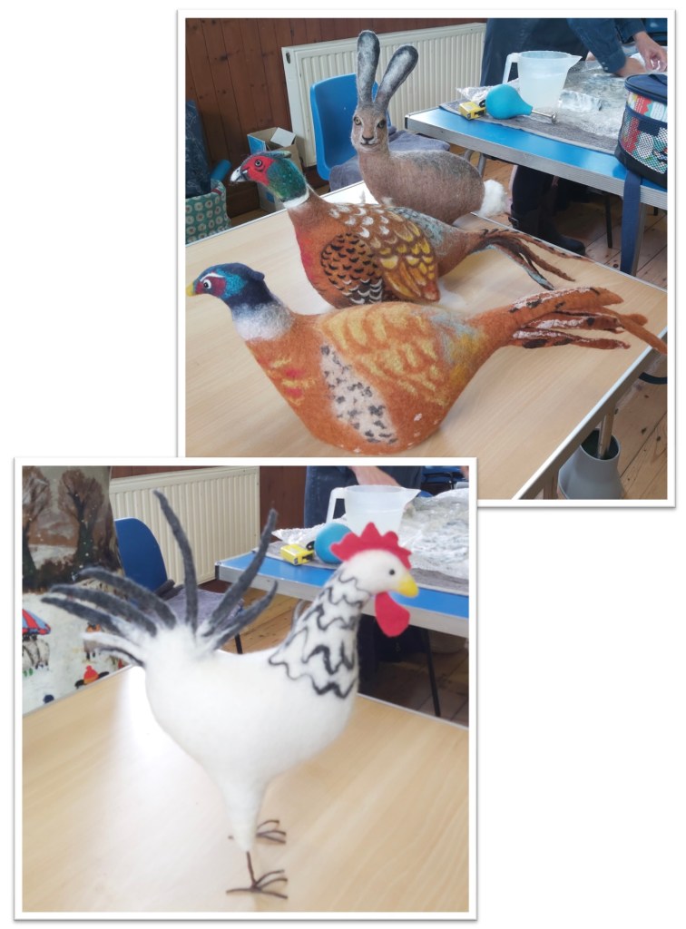 It was a lovely surprise to see that Fiona had also brought along some fabulous wet felted birds and a hare to show me. She made these at home using techniques she had learnt in my Chicken Workshop in Arnesby, Leicestershire last October…..we were all very impressed!