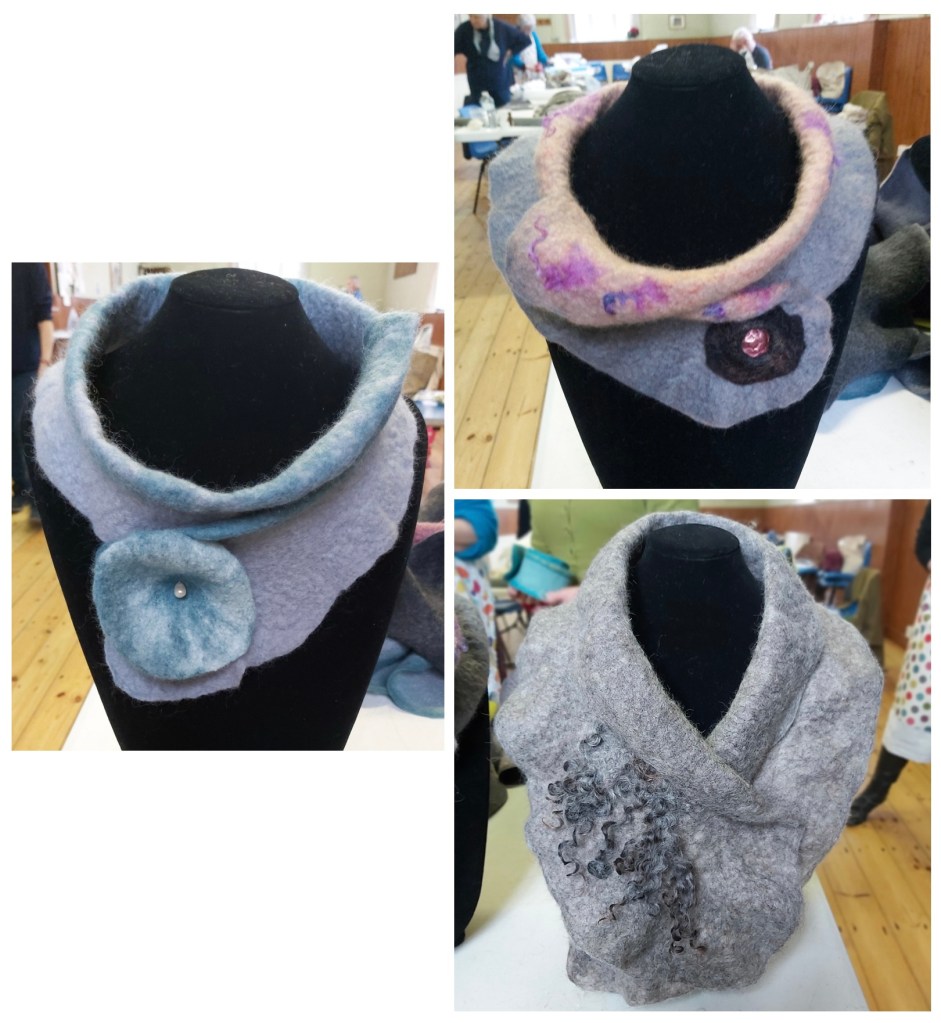My most popular workshop currently has to be the Superfine Merino Roll Edge Collar with brooch fastener. I’ve done a couple of these in my studio recently and last month I travelled down to run the class in Ashby Magna, Leicestershire for Region 8 of the International Feltmakers Association. Ten ladies attended the class and achieved some really wonderful results.