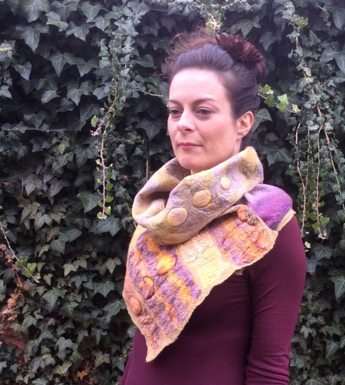 My Nuno felted Autumnal Collar has been left to dry overnight and this is how the finished piece looks……