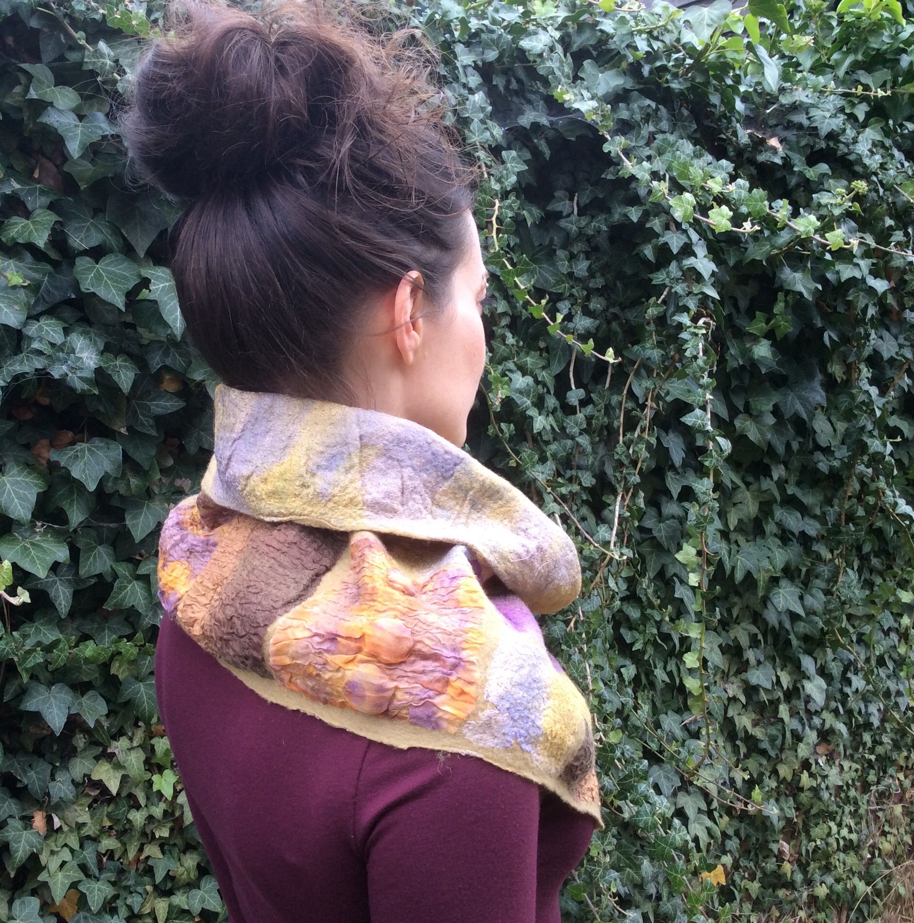 I was pleased with the shape and size of the grey merino collar I made recently so thought I would stick with those proportions to make an Autumnal Nuno Collar using the “tile” technique.