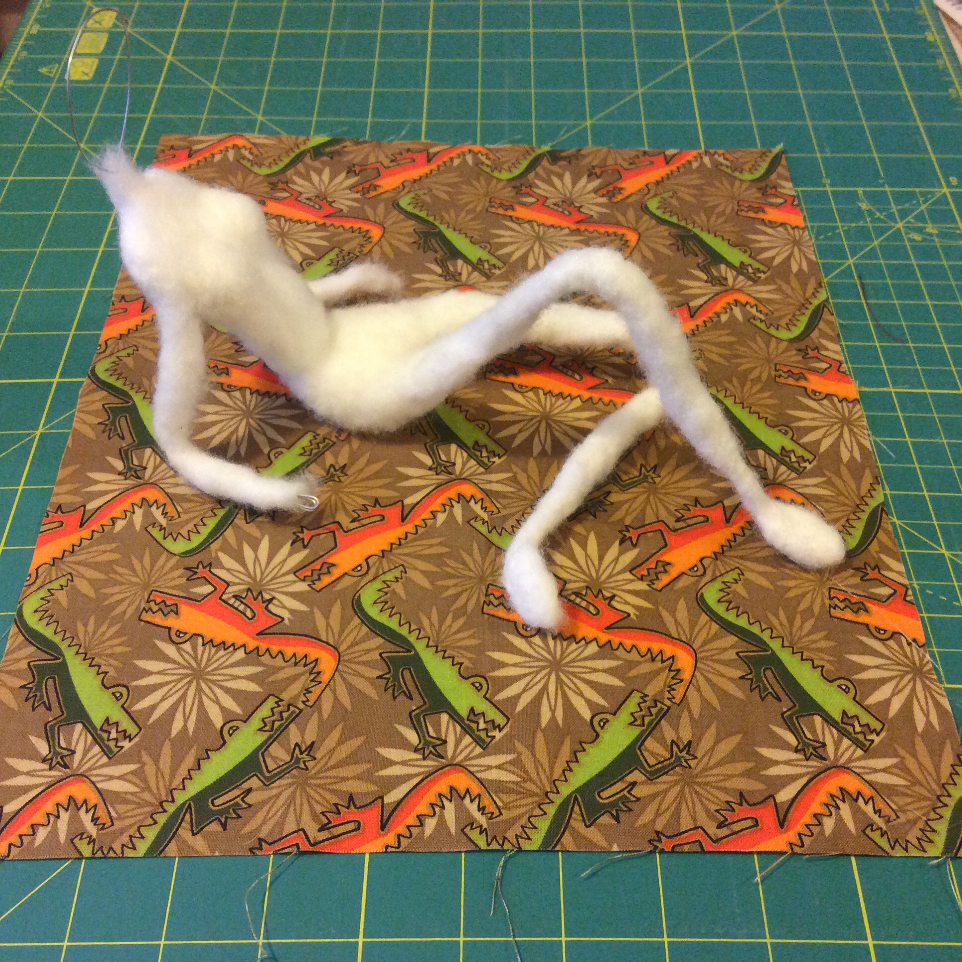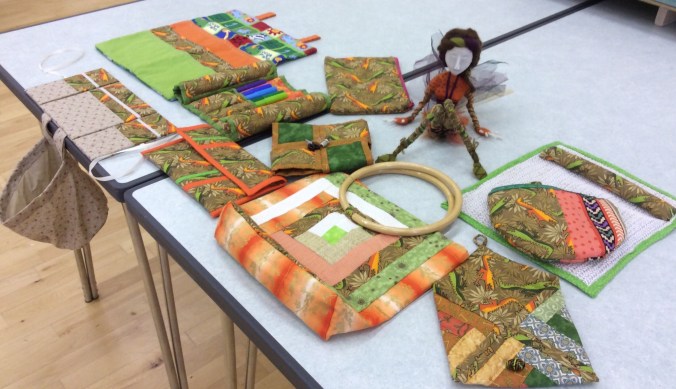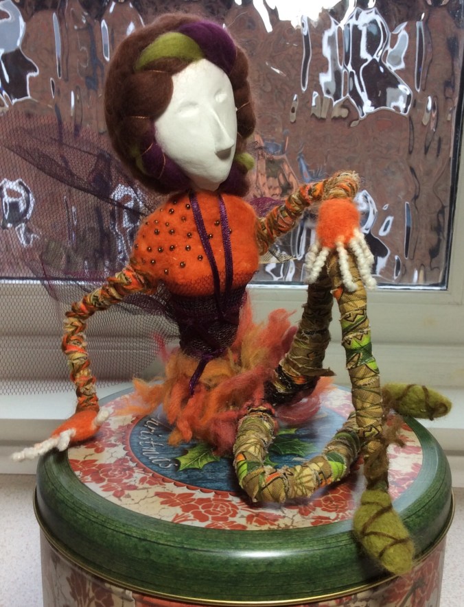 The second project was this years “ugly” fabric challenge with Sitting Ducks. Each year, just before Christmas, one of our members supplies us all with an A4 size piece of fabric (which we probably would never have chosen to use ourselves) and we have to make something with it. After a couple of weeks of wondering what to do with my green and orange crocodiles, and knowing that I wanted to completely disguise the pattern, I finally hit on an idea and Griselda was born. She stands 17″ tall, has a wire frame with a needle felted body and fabric wrapped legs & arms. I added three colours of netting as “wings” to make her into an Autumnal fairy. I had intended to make her face from fabric but realised, the night before we were due to hand in our pieces, that if I was going to get her finished in time I needed a quicker solution for her face, hence the air dry clay.