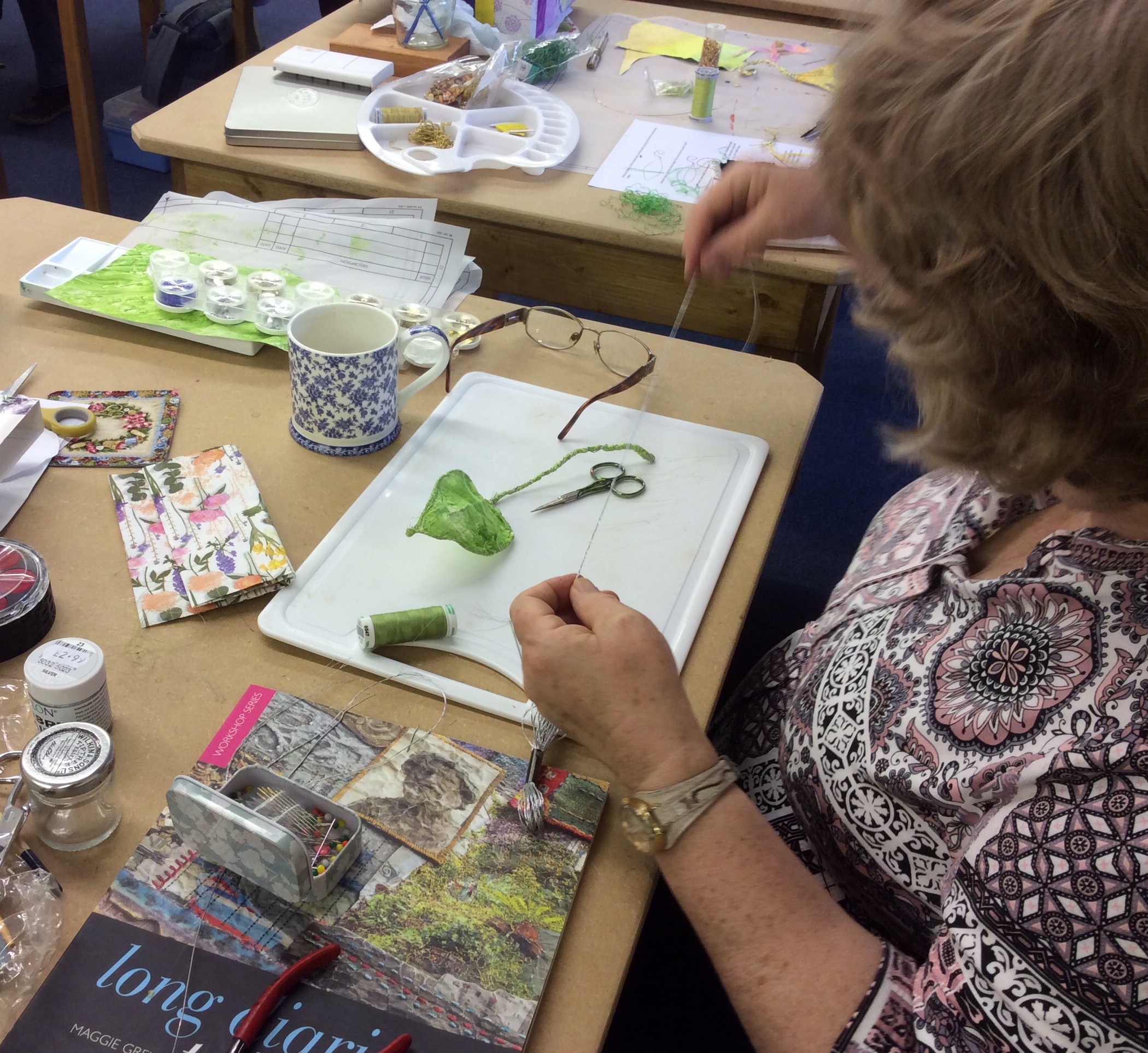 I began by sketching an outline and coloured the fabric with Inktense blocks. Once the paint was dry I drew the veins, using a Frixion pen. The leaf and the veins were then machine stitched using Gutterman green 100% cotton thread and an open toe embroidery foot. Once the leaf was cut out I used my heat tool to distress it. It was at this stage that I discovered Lutradur doesn’t shrink and distort like Tyvek……it wasn’t reacting as I had thought it would. I had made the leaf larger than it needed to be thinking it would shrivel but it turns out that when you blast Lutradur with heat your work retains its overall shape and size. Having said that, I loved the lacy effect it created and was really pleased with the finished leaf skeleton.