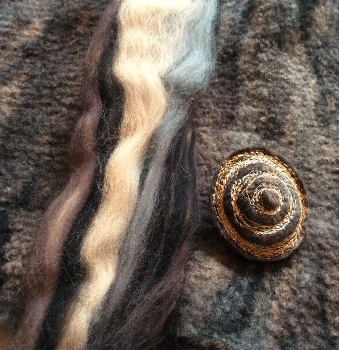 My latest Merino wool collar has been created using 23micron wool tops from Bronte Glen.  I love greys and neutral shades so was automatically drawn to this particular blend called Storm.  It’s made up of Raven, Granite, Mocha and Champagne and, although it turned out darker than I expected, I absolutely love it!  The circular brooch is made from the same wool and machine embroidered using Madeira rayon threads.