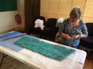Today I joined a small group of ladies for a wet felting workshop in the Thomas Garrett Rooms in Heighington near Lincoln.  The ladies meet once a month for felting and they were all keen to learn how to make Merino collars.  The group all had specific ideas of how they wanted their collar to look and everyone was thrilled with how their work turned out.